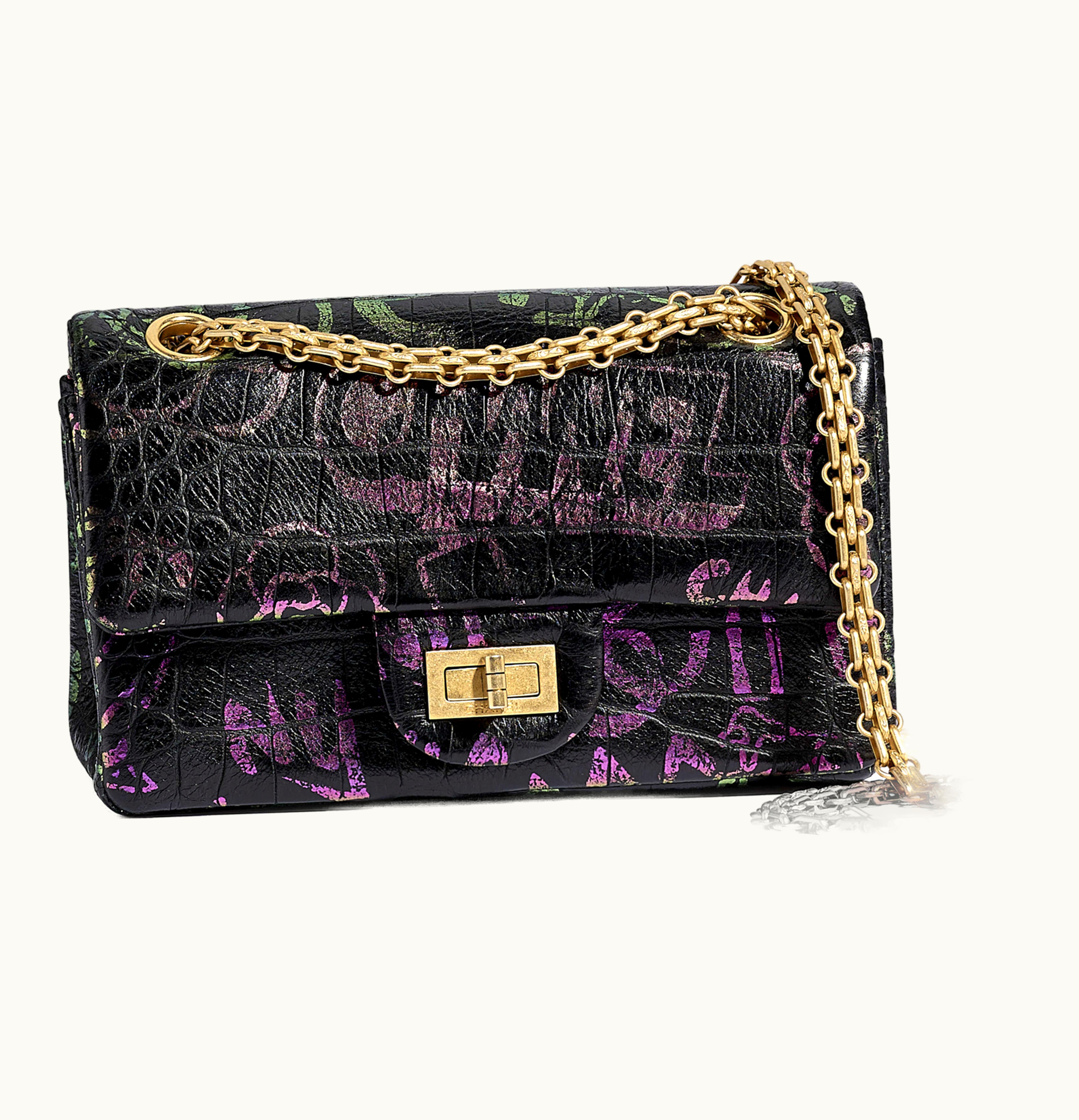 Chanel 255 Handbag Crocodile Embossed Printed Leather Gold tone Small Black Pink | GLINT