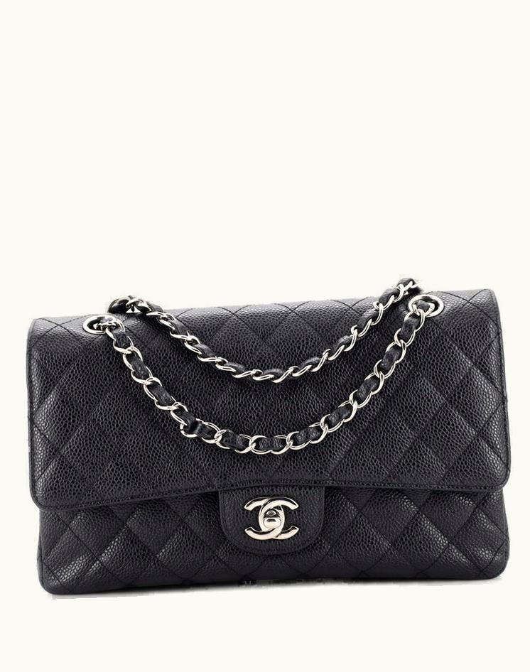 Chanel Classic Double Flap Bag Quilted Caviar Medium Leather Black Silver | GLINT