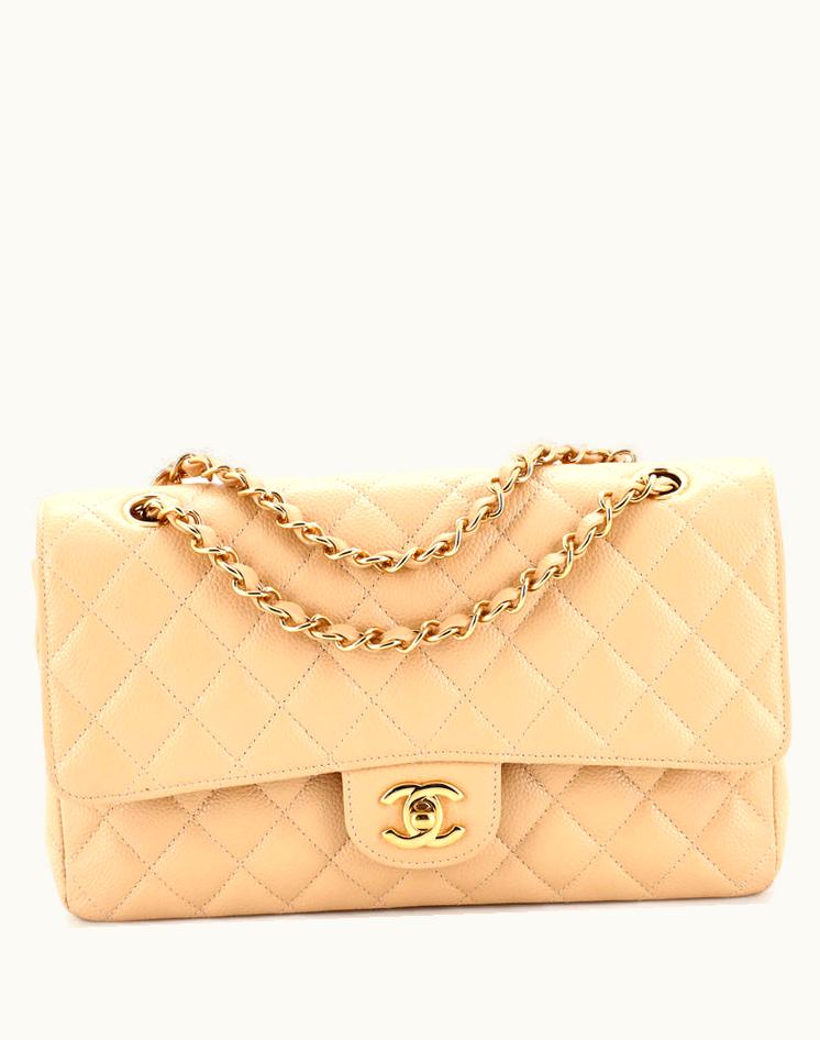 Chanel Classic Double Flap Bag Quilted Caviar Medium Leather Neutral Gold | GLINT