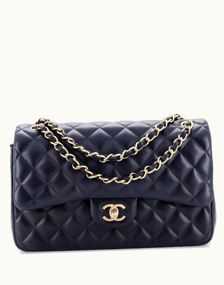 Chanel Classic Double Flap Bag Quilted Lambskin Jumbo Blue Gold | GLINT