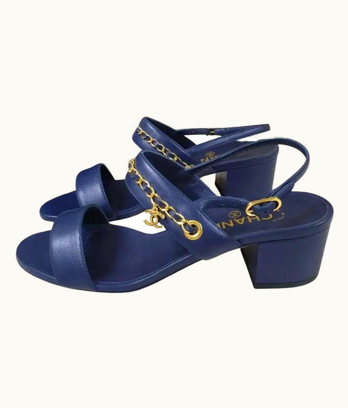 Chanel Navy Block Heels Chain Sandals | GLINT