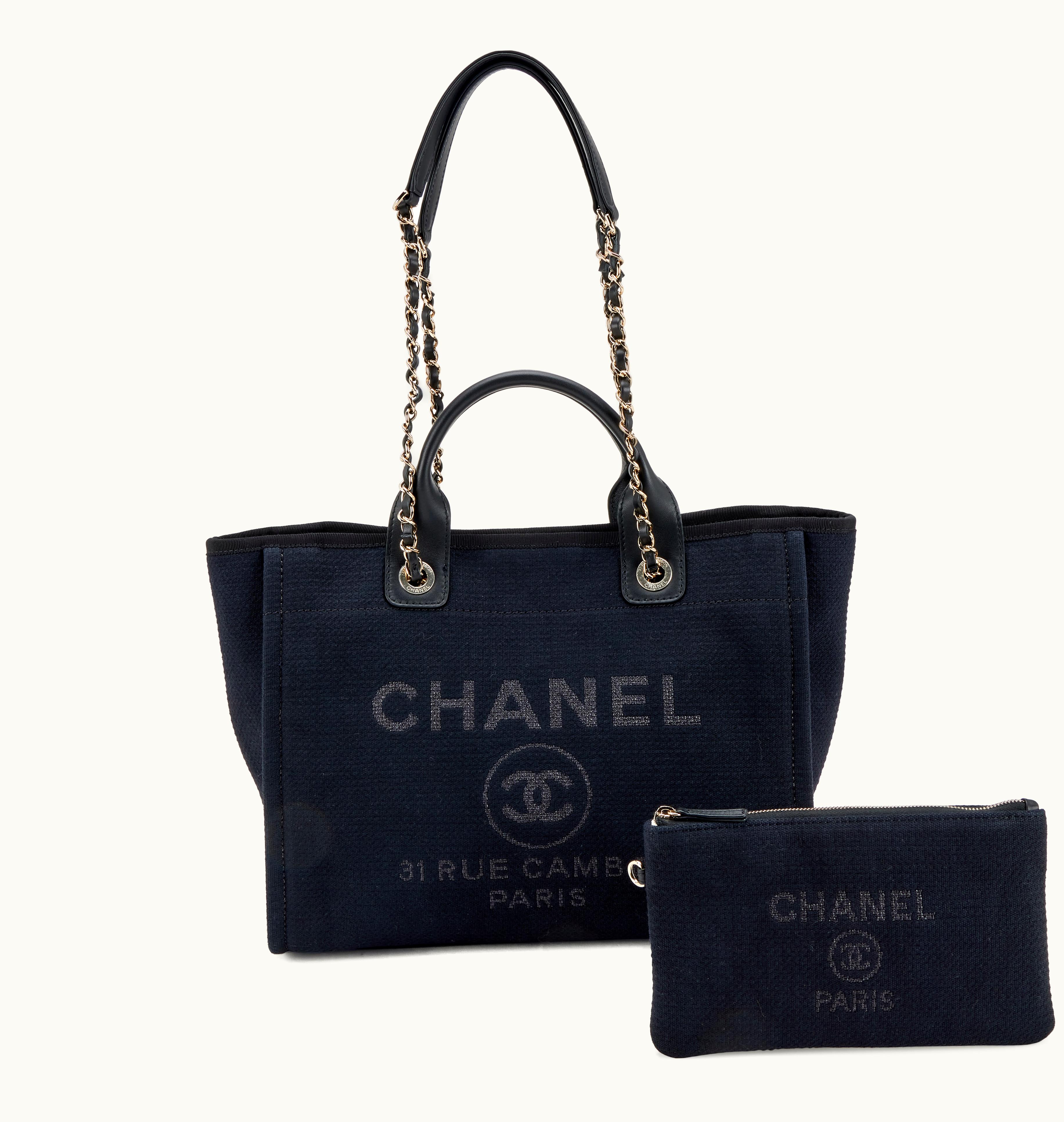 Chanel Small Deauville Tote with Black Woven Design and Gold Hardware | GLINT