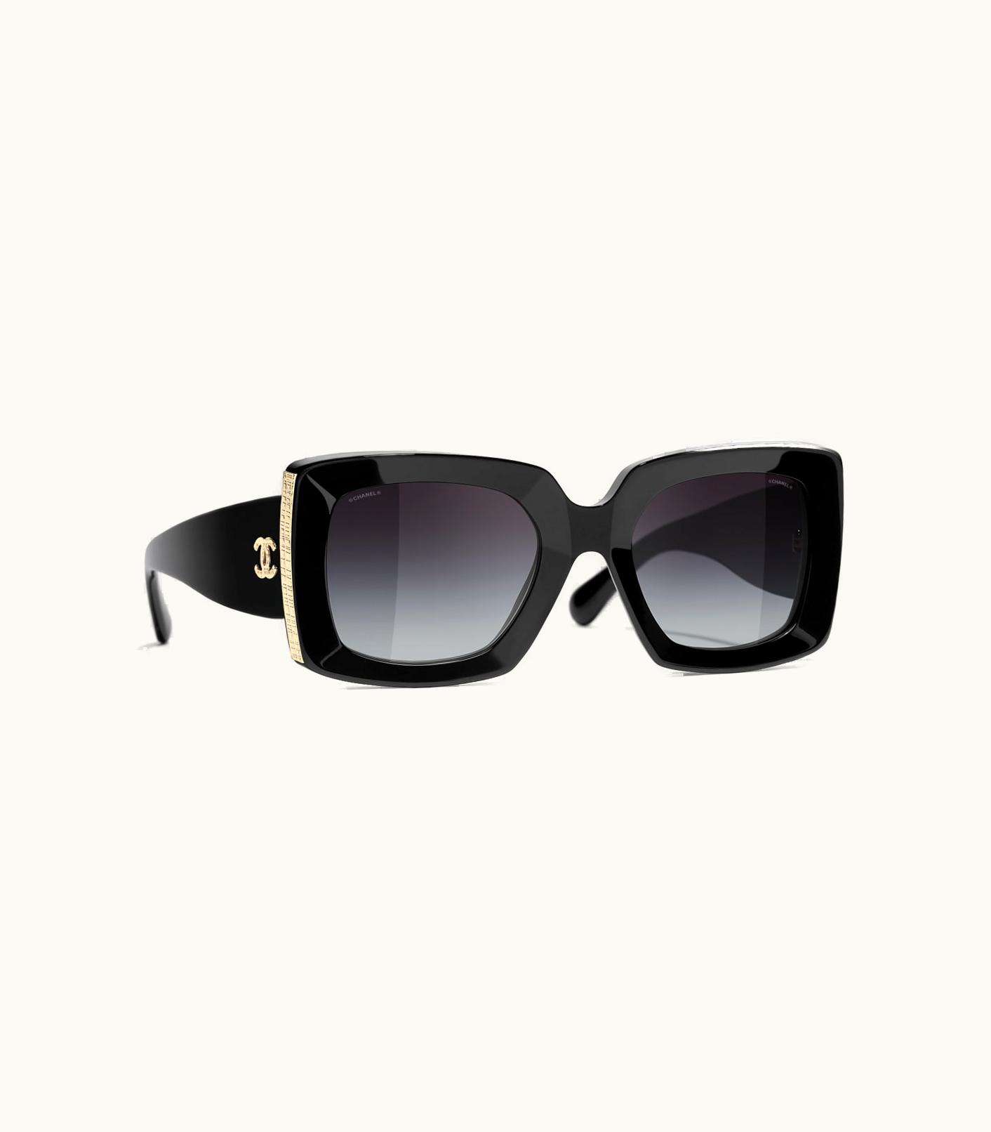 Chanel Sunglasses: Rectangle Sunglasses, Acetate Black & Gold | GLINT