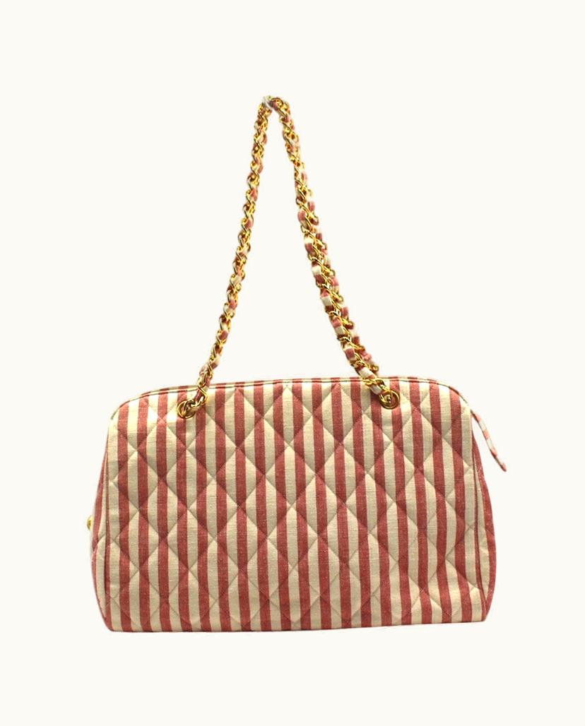 Chanel Women's Shopper Canvas Pink & White Striped Gold Chain Leather Bag | GLINT