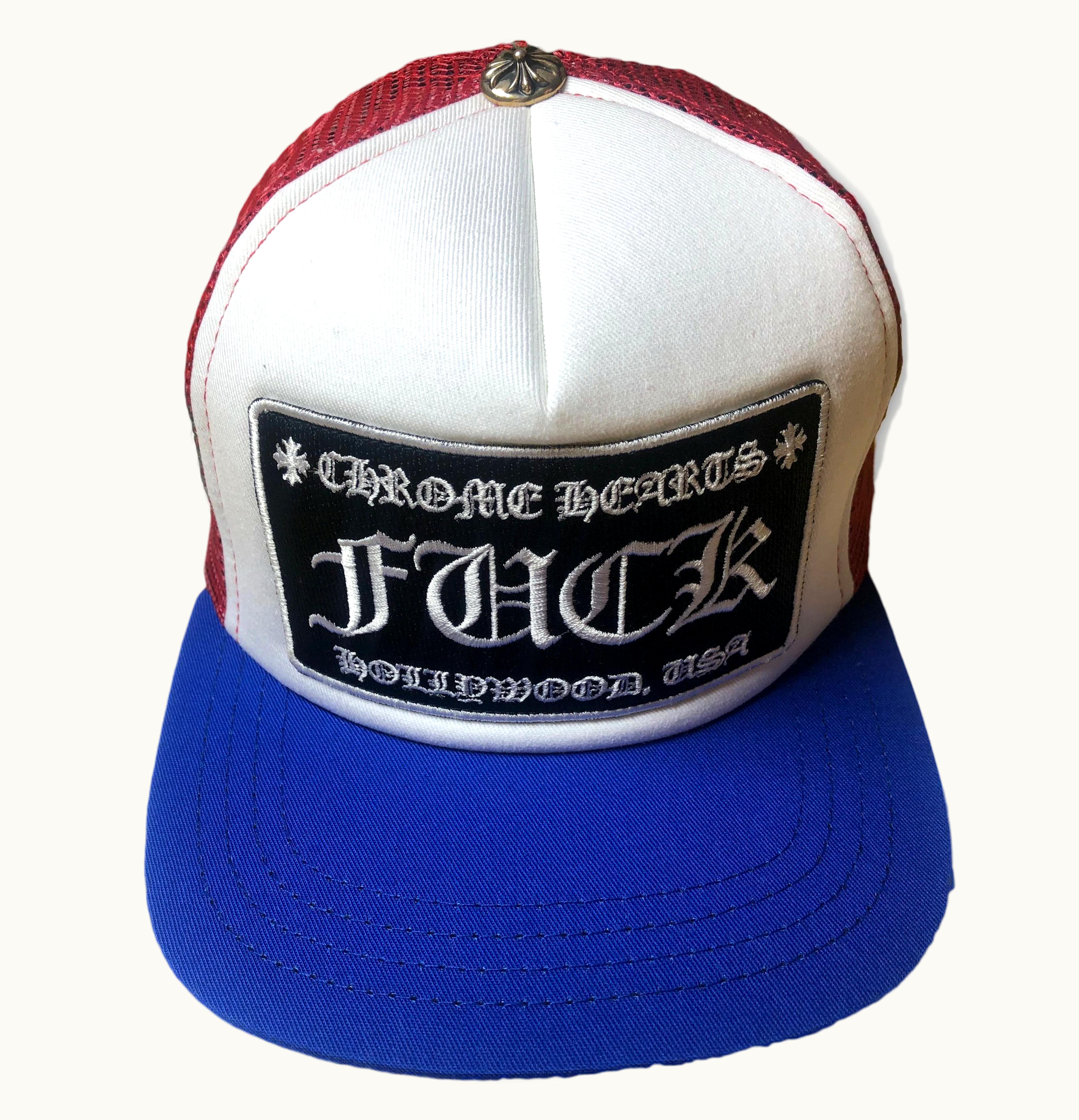 Chrome Hearts FUCK Hollywood Trucker Hat Red White Blue | GLINT