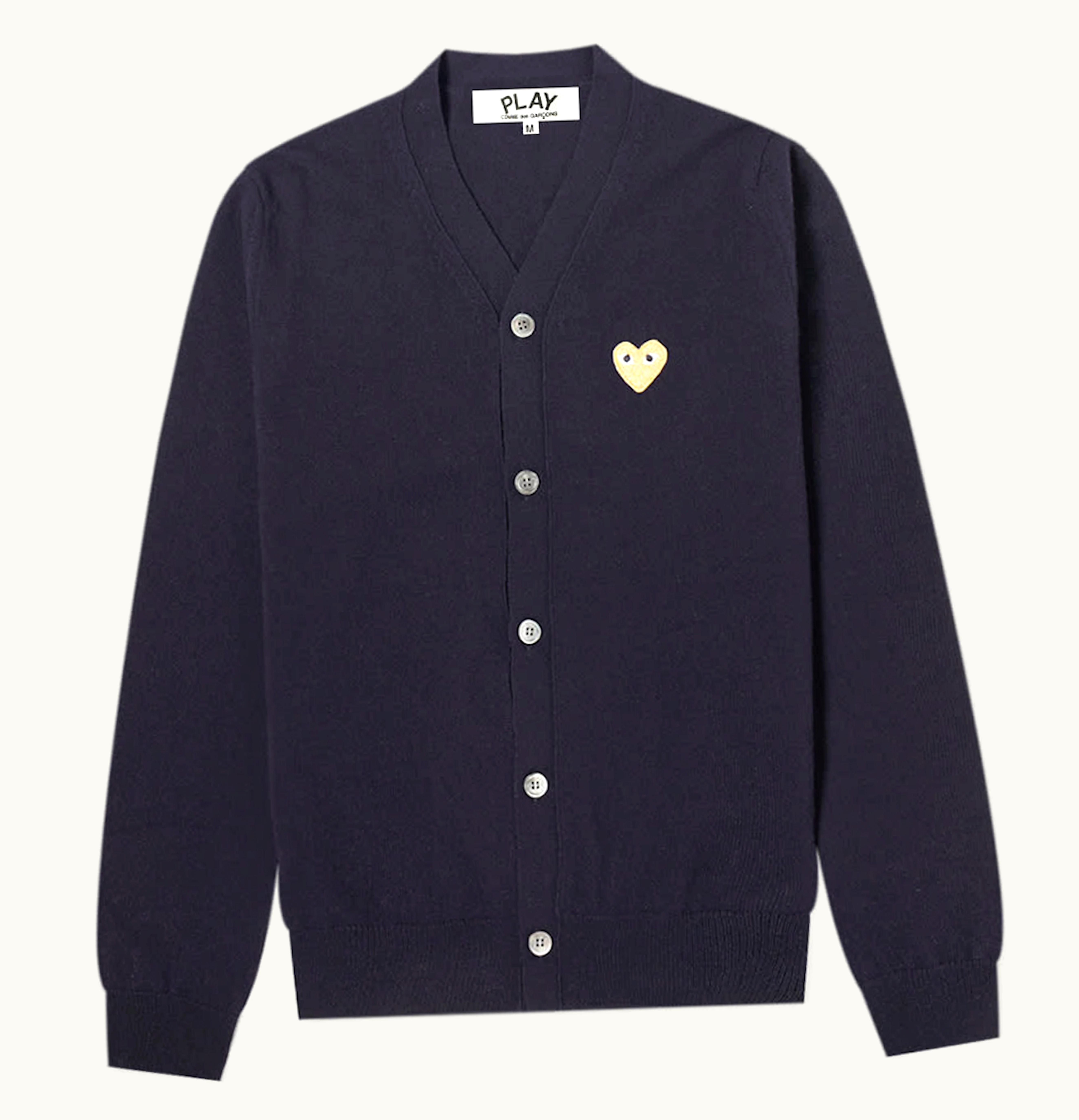 Comme des Garcons PLAY Beige Heart Fine Knit Wool Cardigan Navy Beige | GLINT