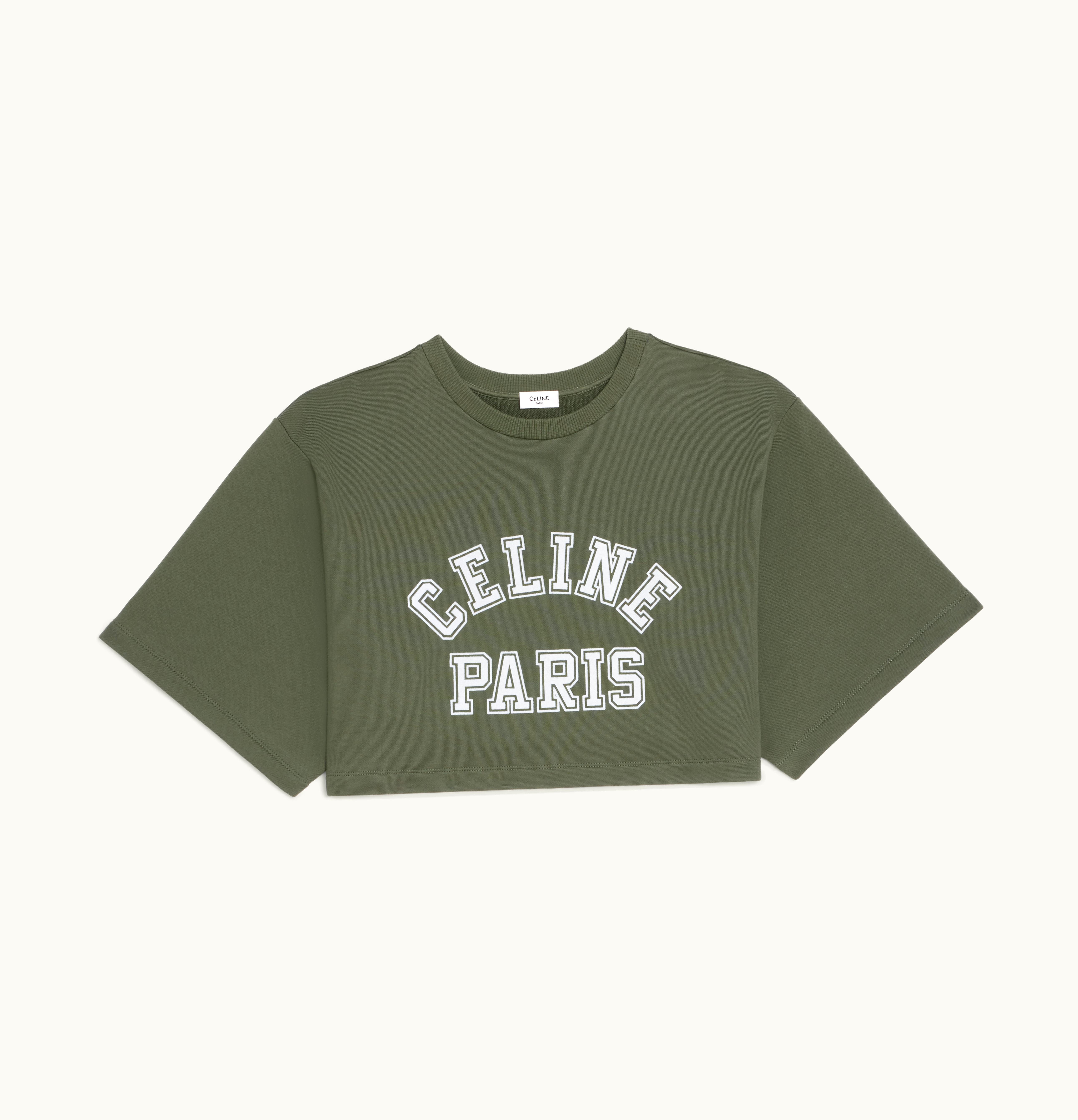 Celine Cropped Celine T-Shirt In Cotton Fleece Kaki Militaire/Off White | GLINT