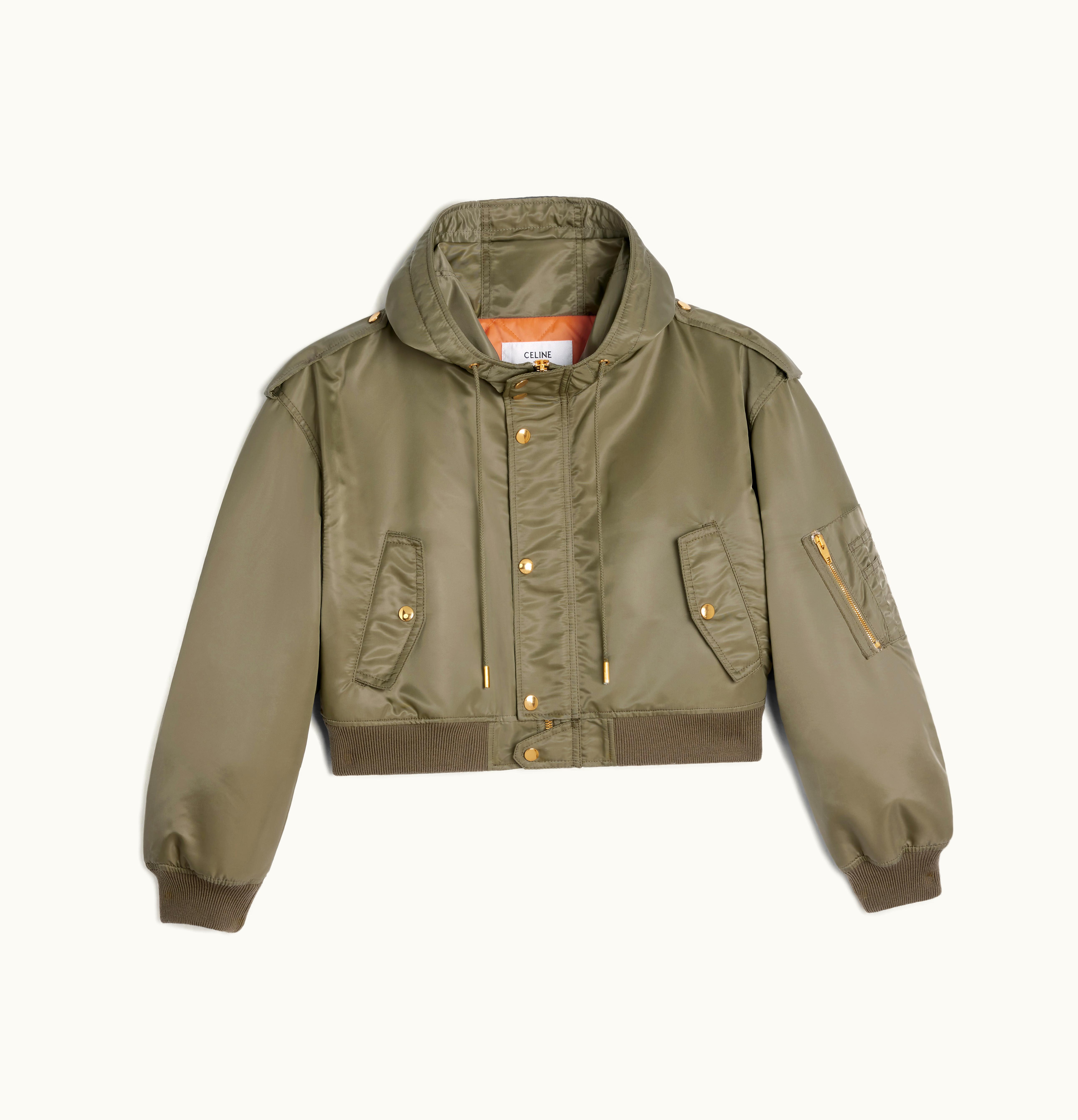 Celine Cropped Military Bomber Jacket In Nylon Twill Kaki | GLINT
