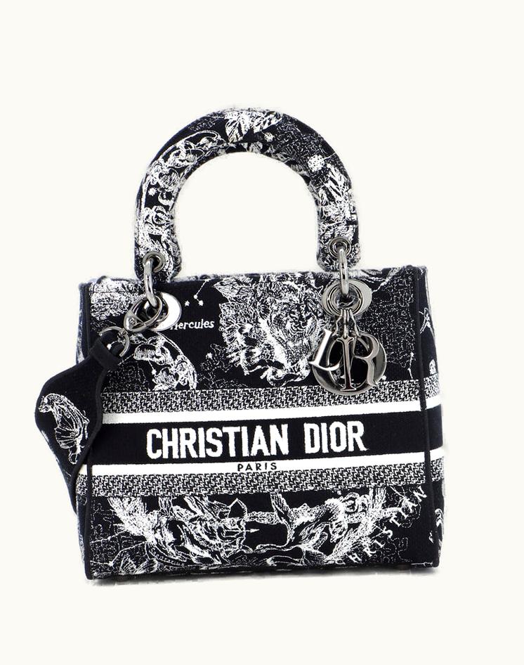 Dior Lady D-Lite Bag Embroidered Canvas Medium Black/White Gun Metal | GLINT