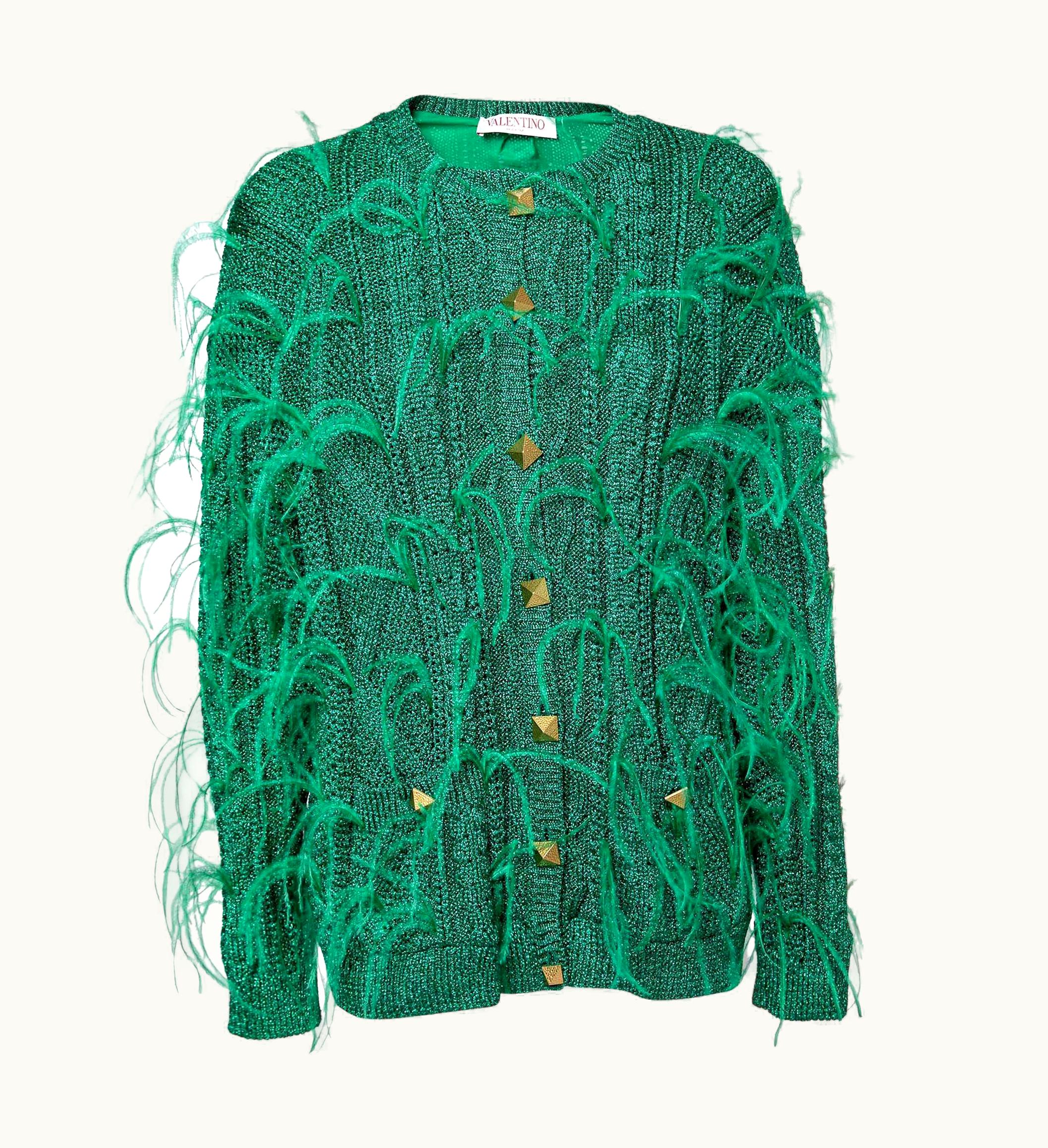 Valentino Metallic Green Feather Embellished Cardigan | GLINT