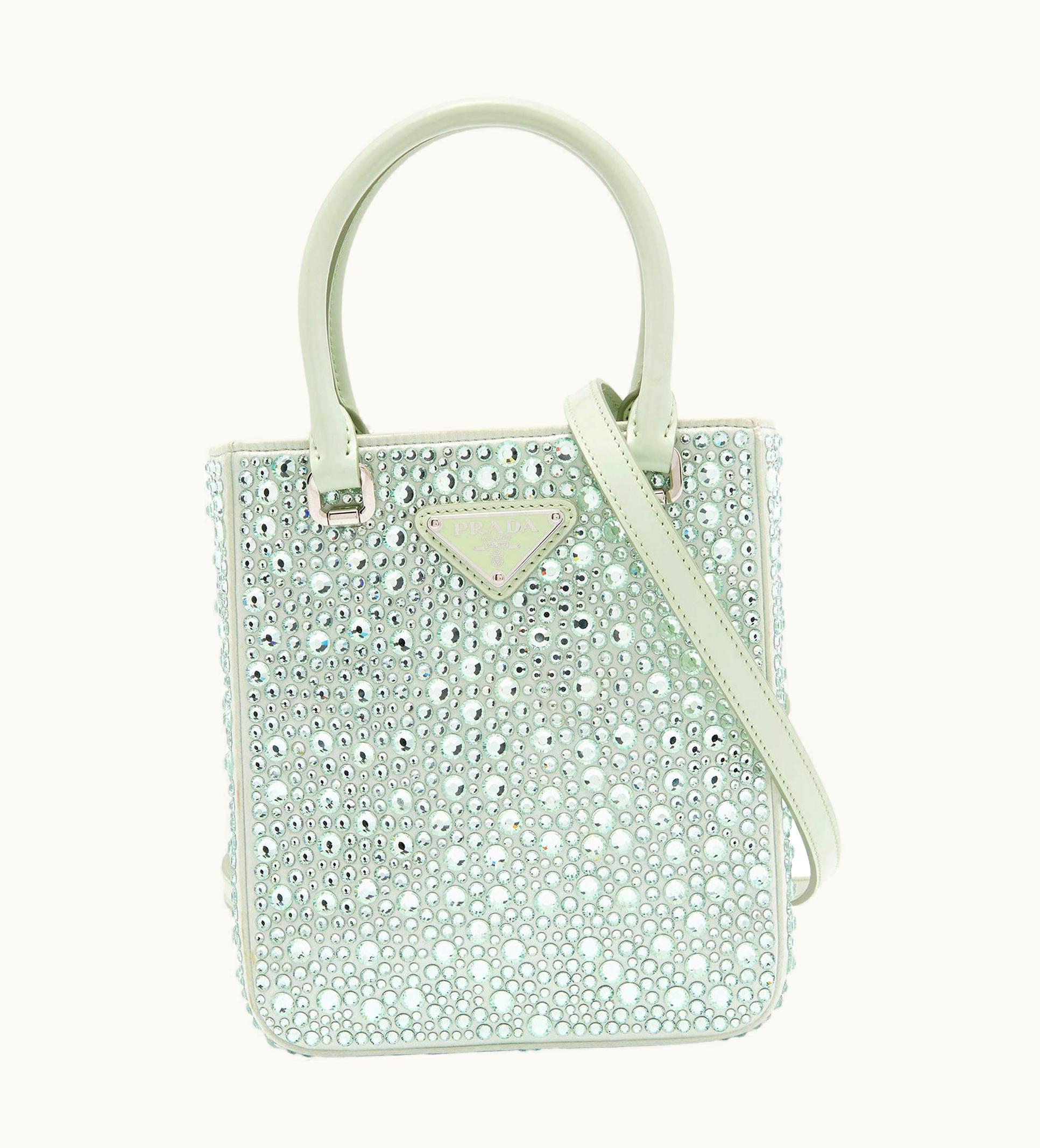 Prada Green Crytal Embellished Satin Small Tote | GLINT