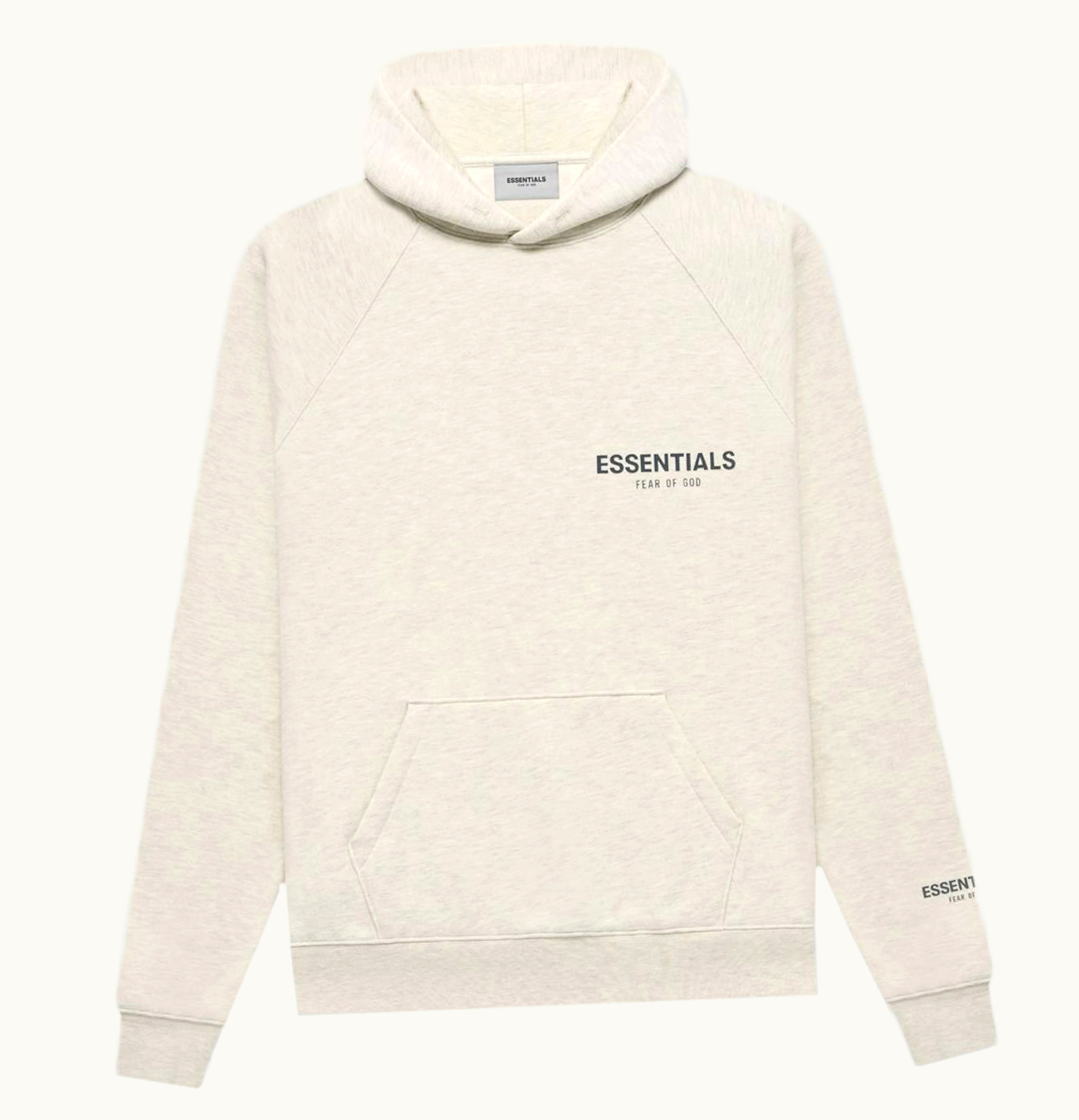 The 2021 Core Collection by Fear of God Essentials includes over 40 apparel items, including the Light Heather Oatmeal Pullover Hoodie. This hoodie boasts dropped shoulders and extra volume in the body, crafted from a blend of 80% cotton and 20% viscose. The hoodie features logos on the wrist, chest, and hood, representing the brand's signature style. <br> <br> On December 8th, 2021, the Fear of God Essentials Pullover Hoodie in light heather oatmeal was released for retail at a price of $90. GLINT is the platform where this product is available for purchase.