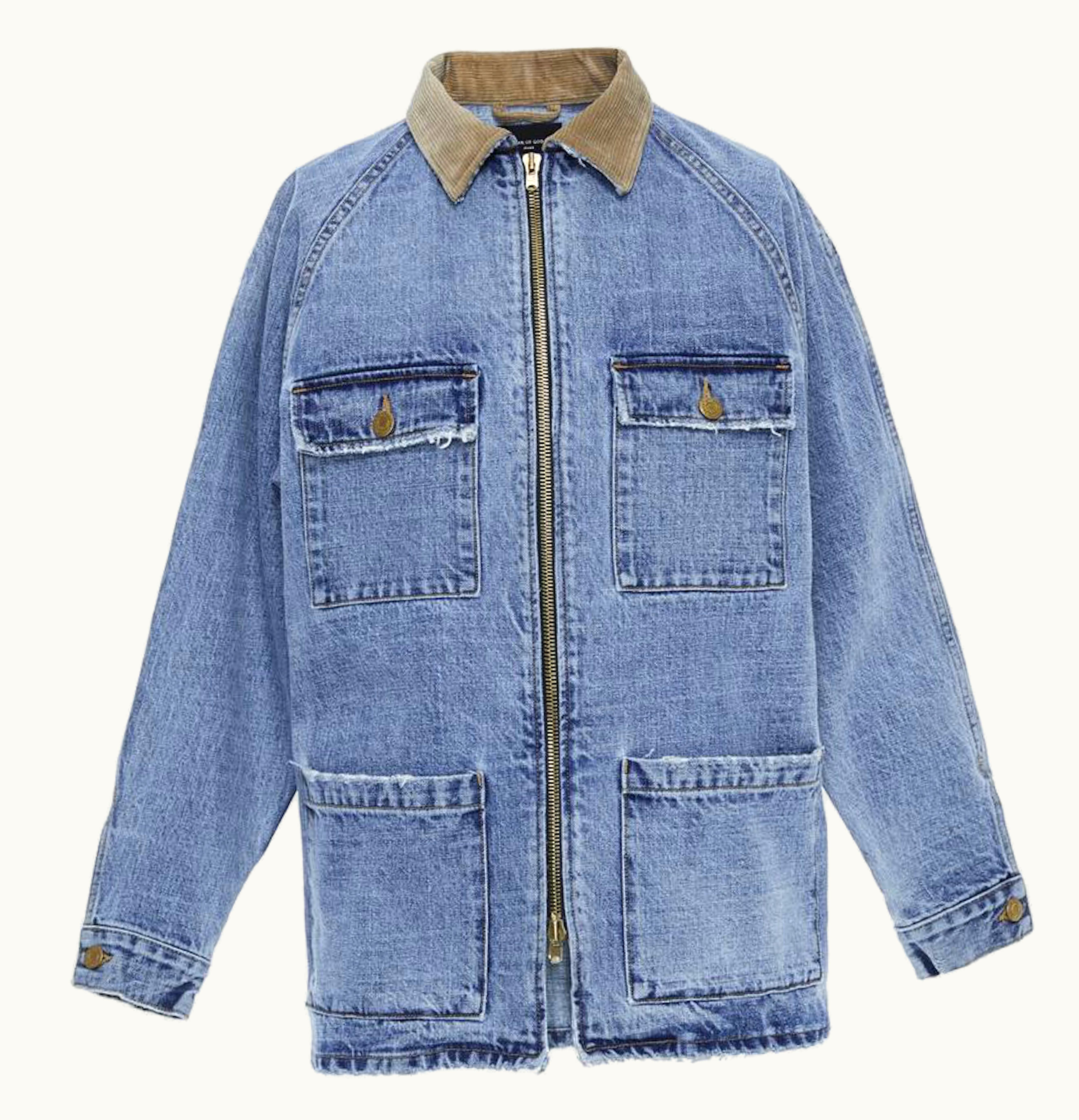 The Fear of God Corduroy Collar Denim Long is a unique and stylish jacket that combines two distinct textures for a bold, statement-making look. The collar is made from soft, velvety corduroy fabric, while the body of the jacket is constructed from durable denim. This jacket features long sleeves with buttoned cuffs, a button-up front closure, and multiple pockets for versatility and functionality. The oversized silhouette and relaxed fit add a comfortable touch to this bold piece, making it the perfect addition to any fashion-forward wardrobe. Whether dressed up or down, the Fear of God Corduroy Collar Denim Long is sure to turn heads and make a statement every time it's worn.