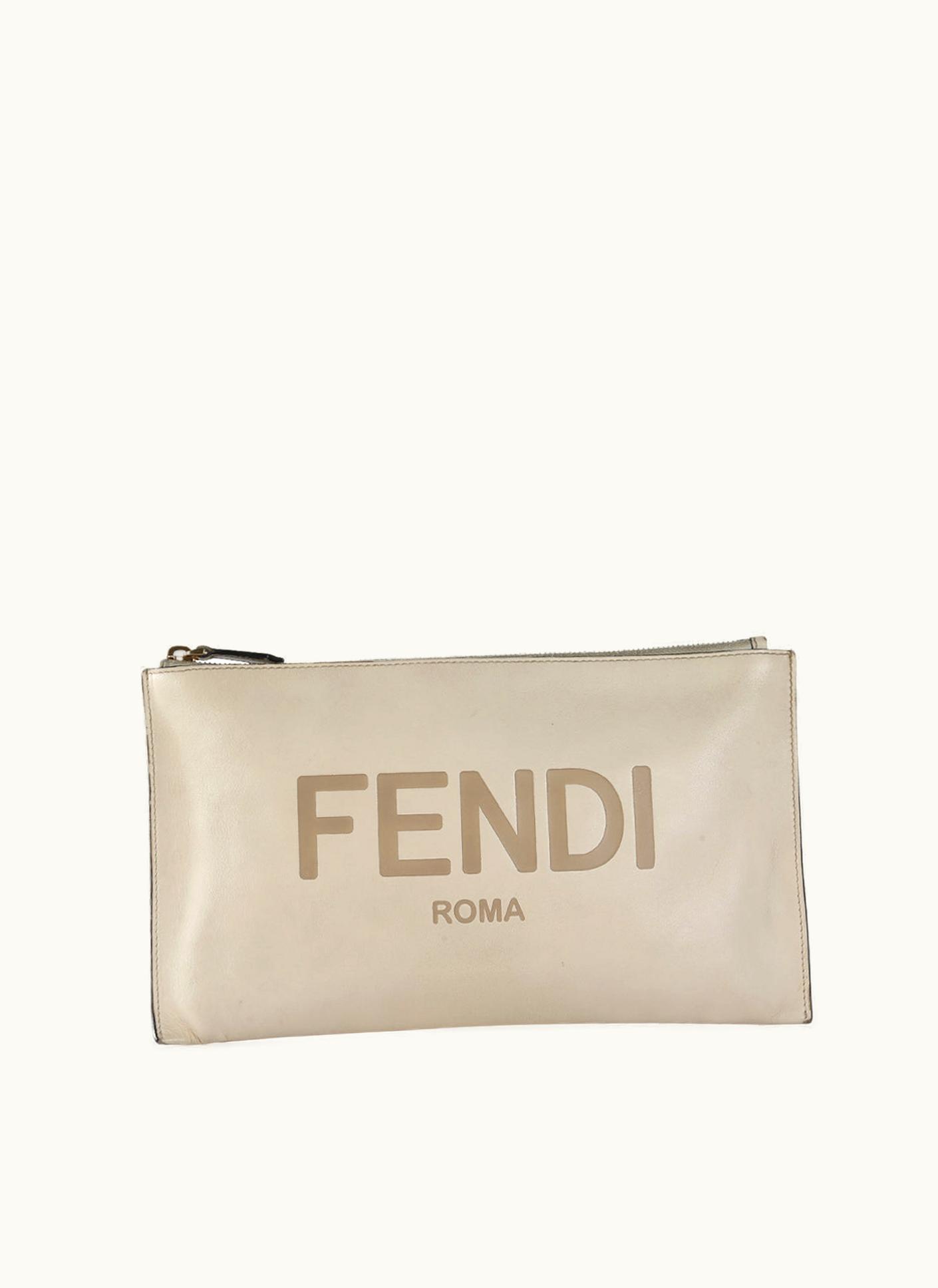 Fendi Beige Debossed Calfskin Leather Logo Clutch | GLINT