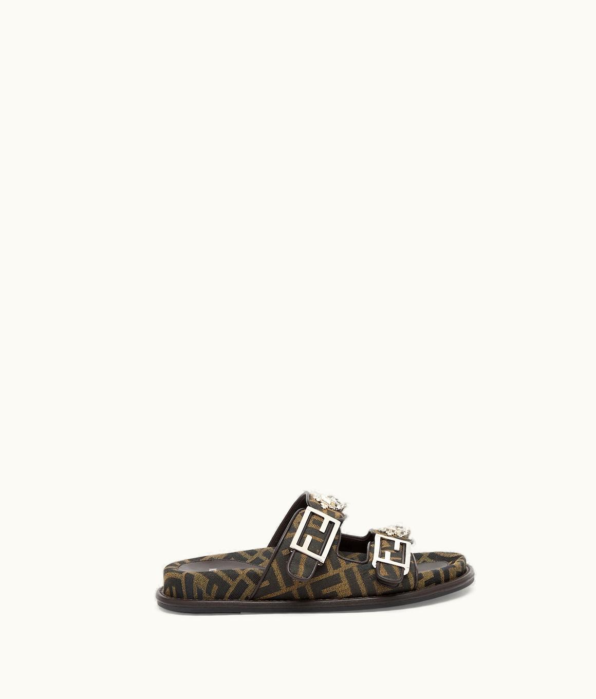 Fendi FF Baguette Crystal-Embellished Brown Fabric Slides | GLINT