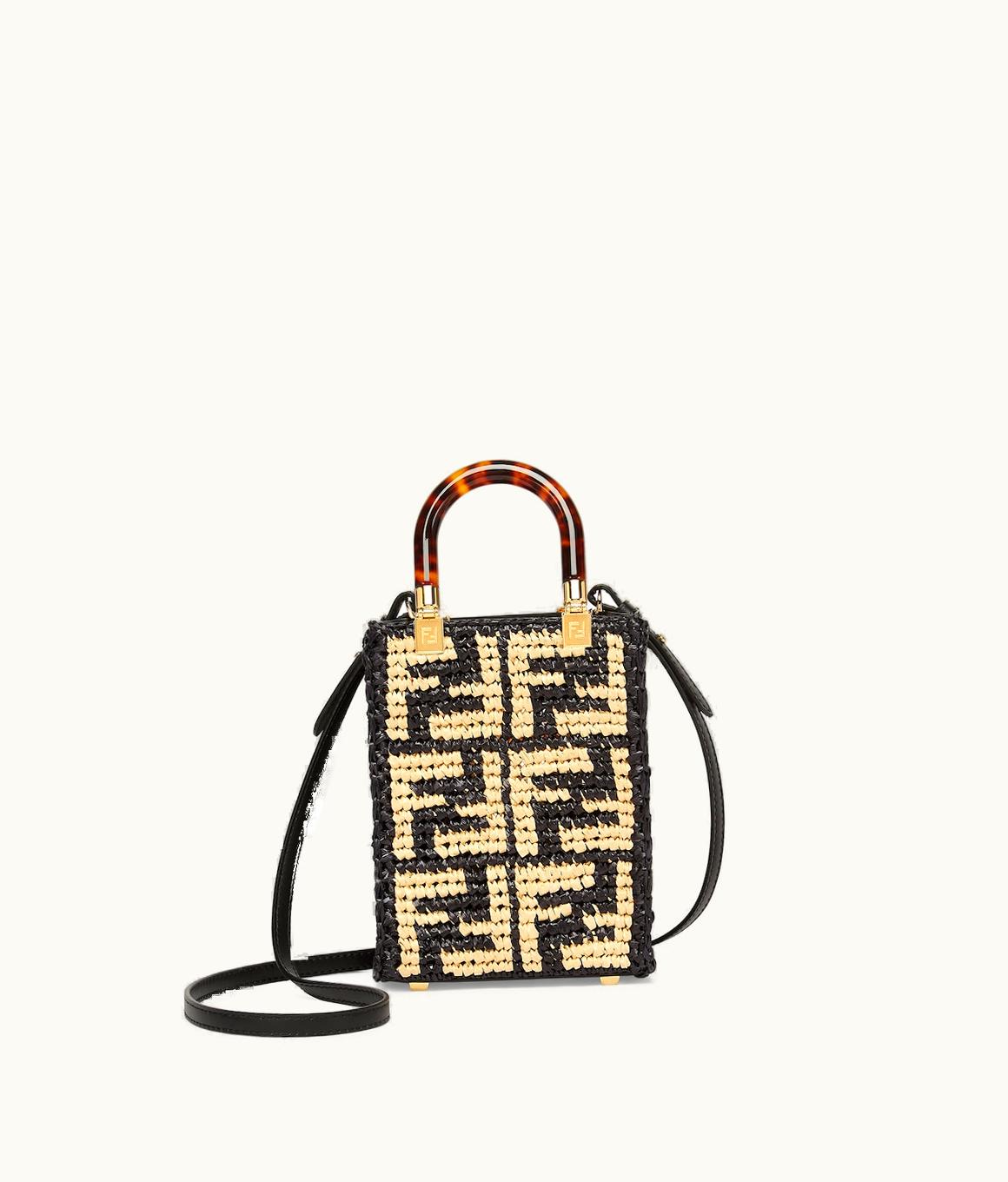 Fendi Mini Sunshine Shopper - Black Raffia Mini Bag With Crocheted FF | GLINT