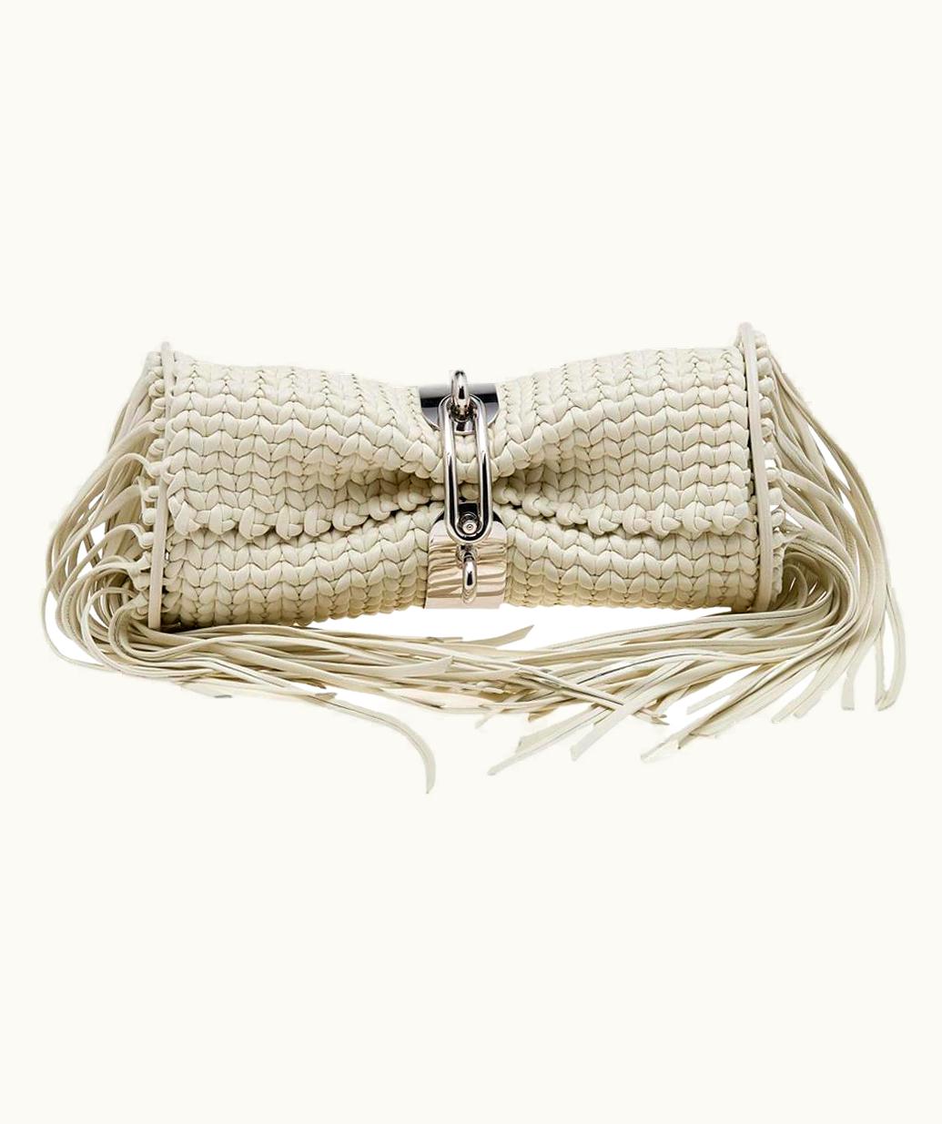Balenciaga White Leather Tresse Raffia Fringe Clutch | GLINT
