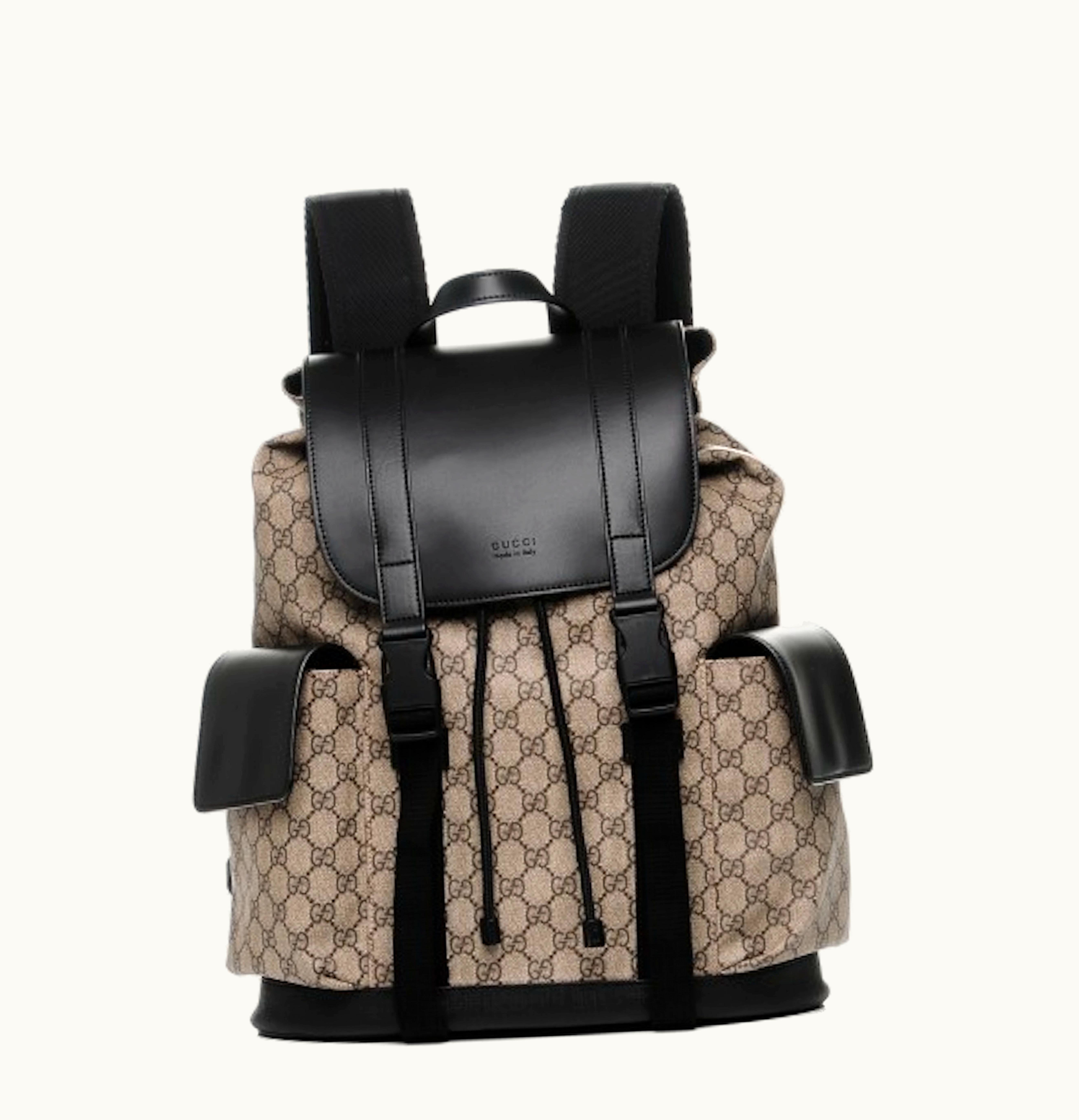 Gucci Backpack Soft Monogram GG Supreme Brown Canvas Black Leather Trims | GLINT
