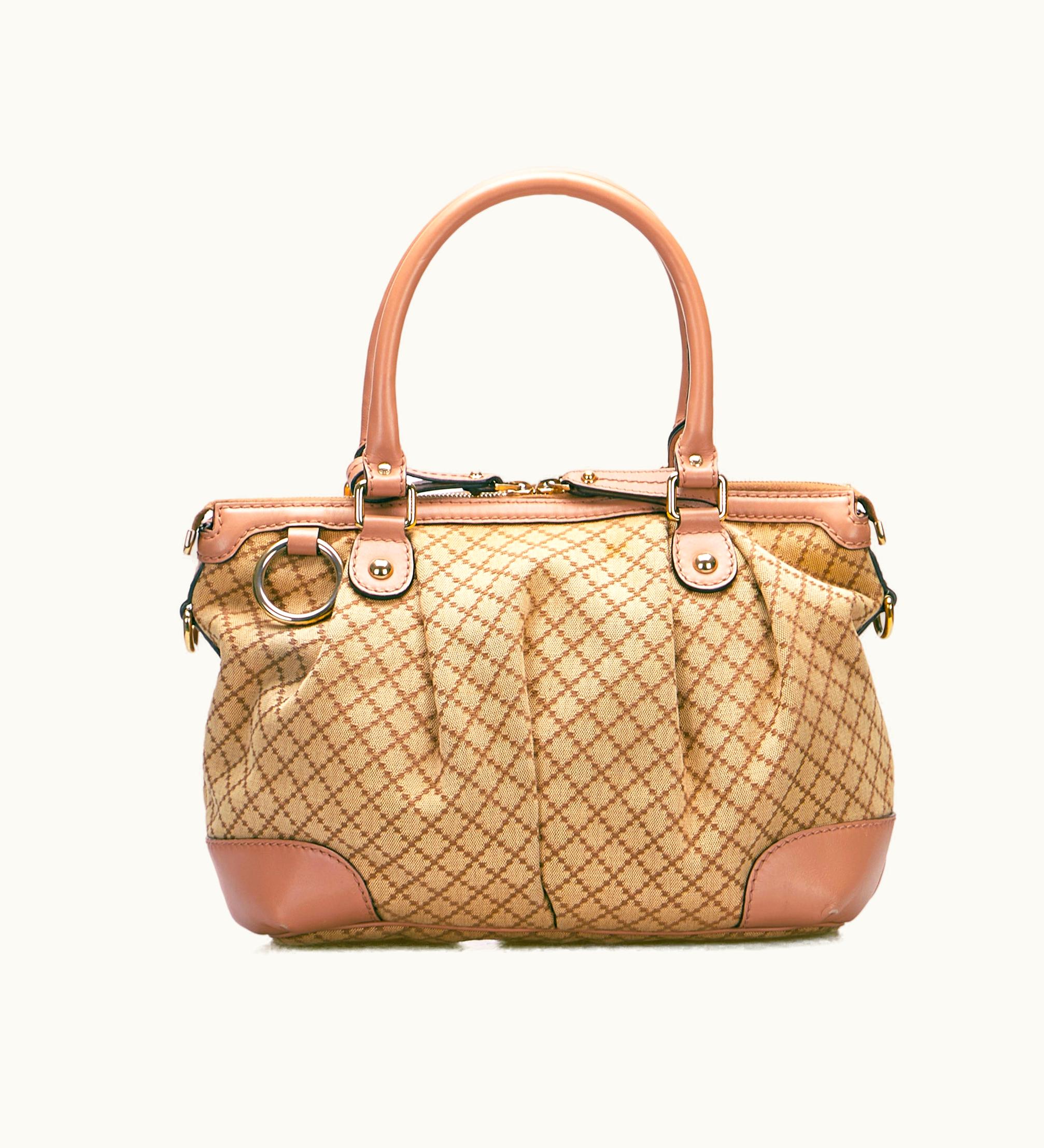 Gucci Diamante Sukey Satchel Canvas Leather Trim Tote Beige | GLINT