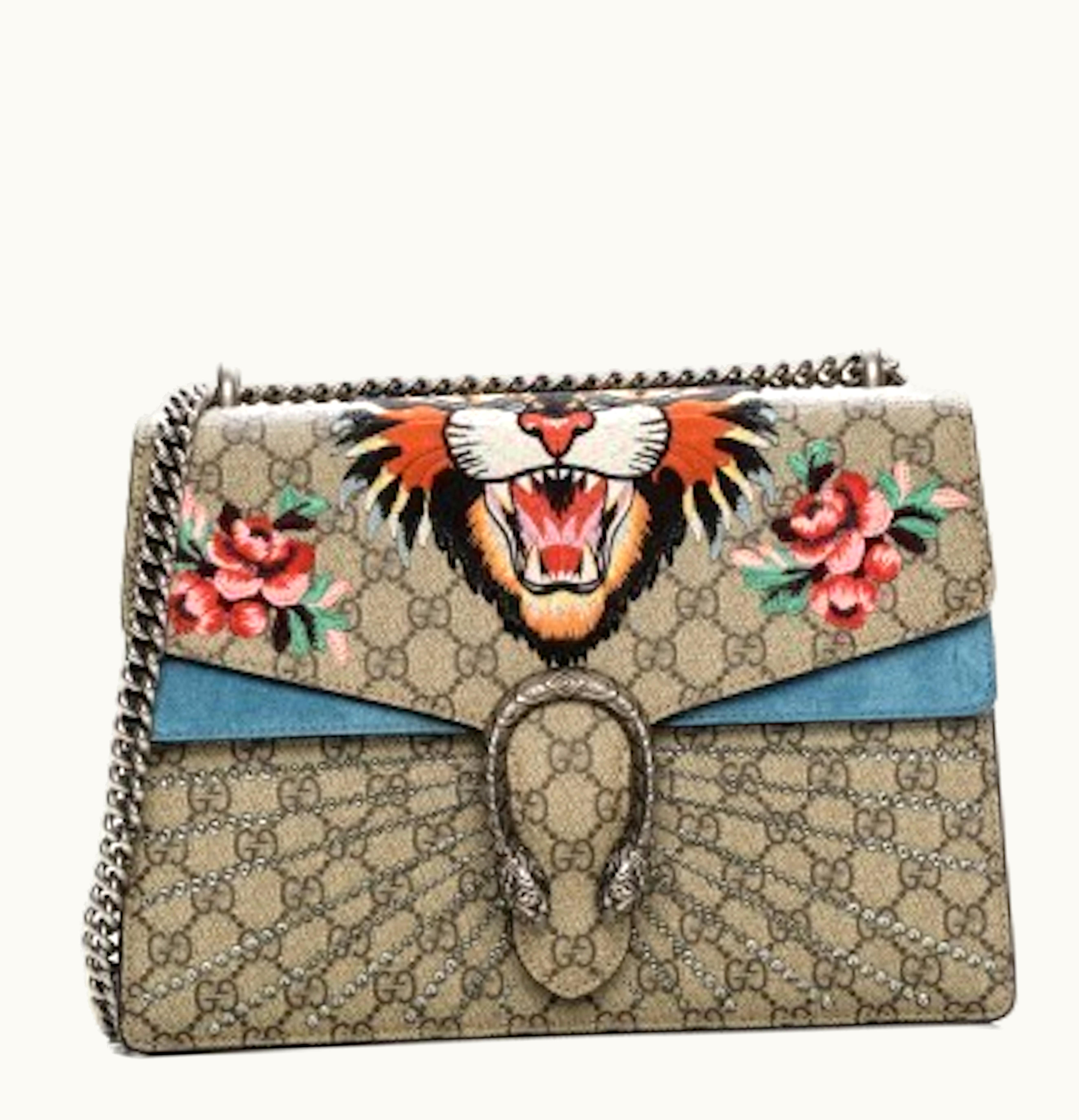 Gucci Dionysus GG Supreme Monogram Embroidered Medium Angry Cat Shoulder Bag Light Blue Canvas | GLINT