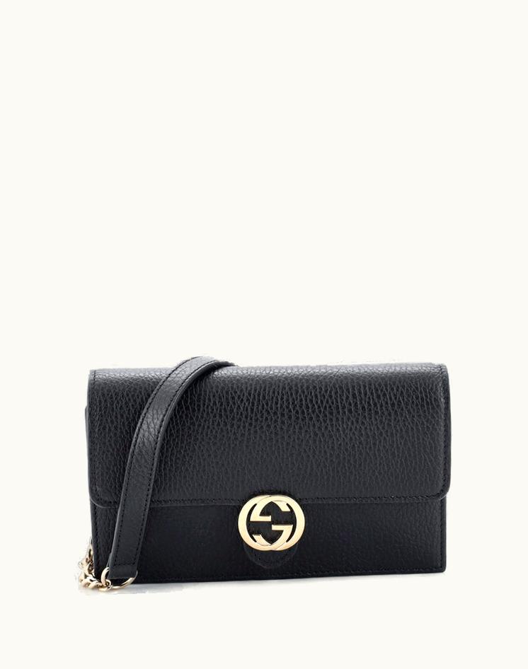 Gucci Interlocking Wallet On Chain Leather Black Gold Tone | GLINT