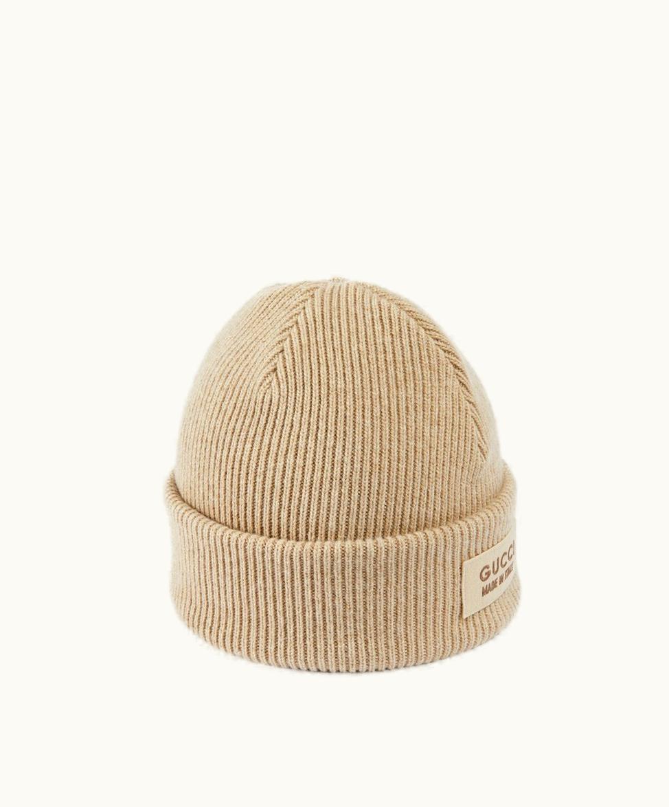 Gucci Knit Wool Hat With Patch Beige | GLINT