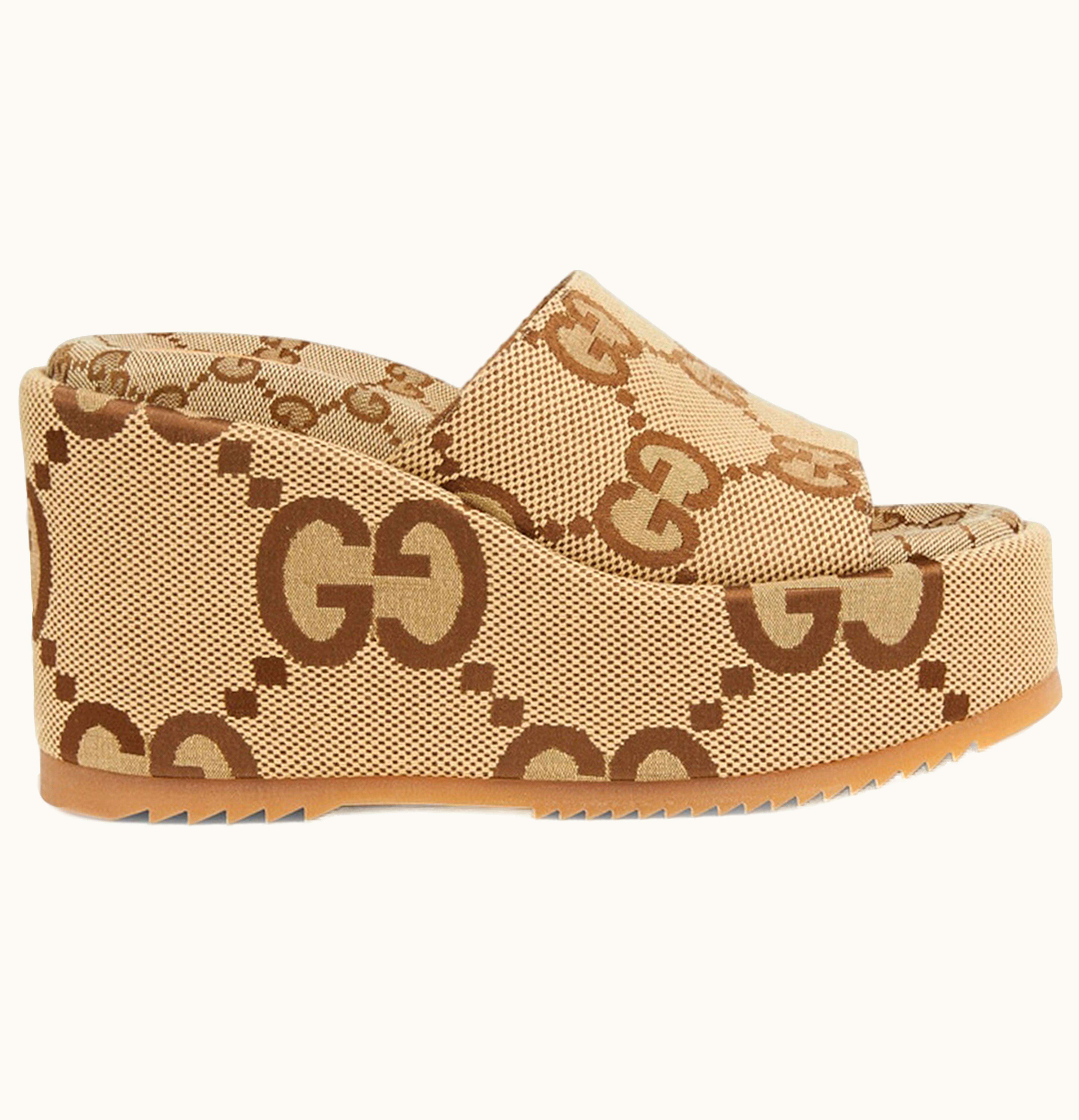 Gucci Platform High Heel Slide Sandal Camel Ebony GG Maxi Canvas | GLINT