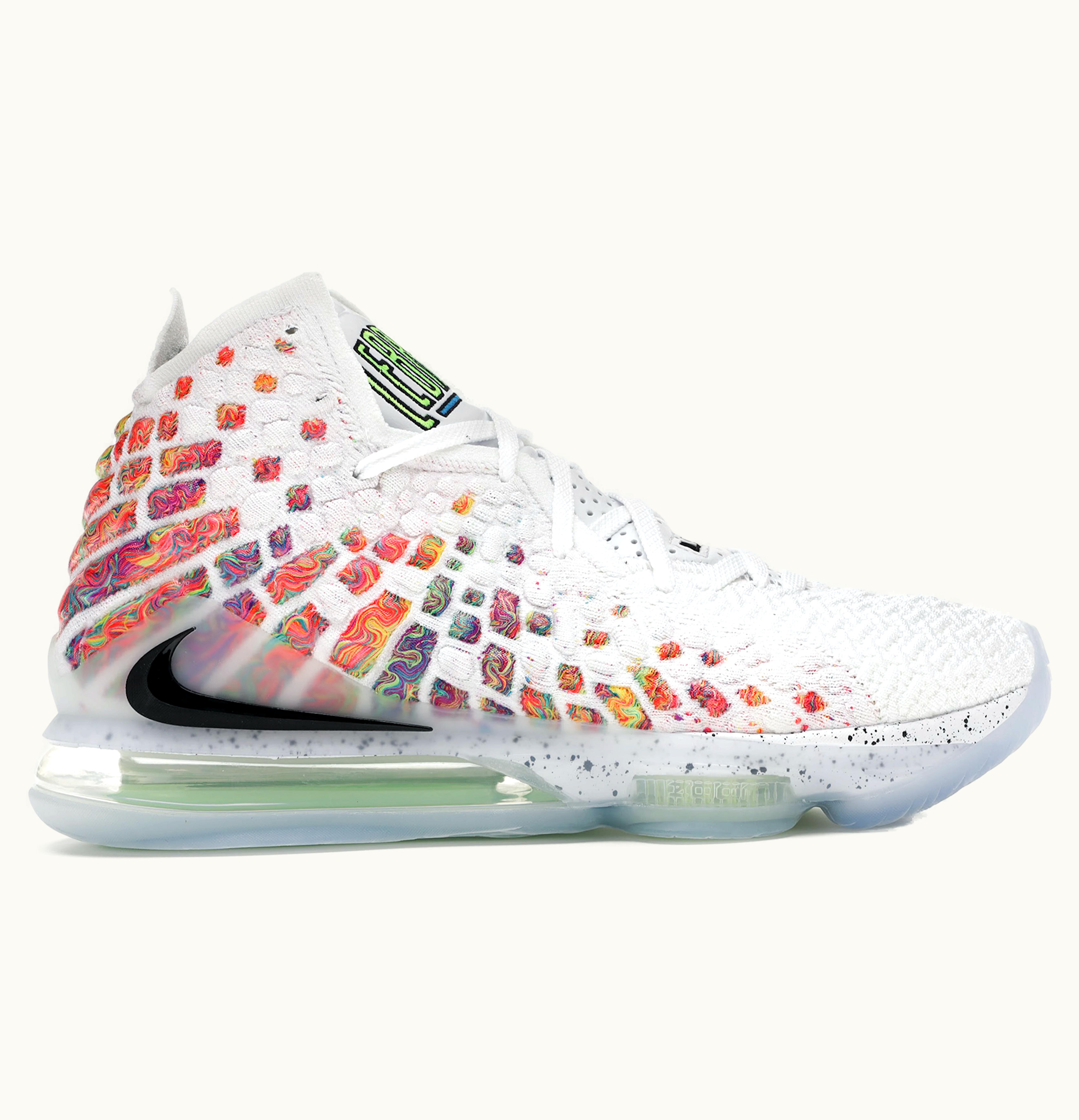 The Nike LeBron 17 Air Command Force is a stylish and high-performance basketball shoe designed to meet the needs of the modern-day athlete. The shoe features a black knit upper with multi-colored accents, giving it a unique and eye-catching look. The upper is also reinforced with leather and synthetic materials, providing durability and support. The LeBron 17 Air Command Force is equipped with Nike's signature Air Max unit in the heel, providing superior cushioning and shock absorption for quick and explosive movements on the court. The shoe also features a Zoom Air unit in the forefoot, offering additional responsiveness and support. To enhance traction and grip on the court, the LeBron 17 Air Command Force has a rubber outsole with a unique tread pattern that provides excellent grip on both indoor and outdoor surfaces. The lace-up closure ensures a secure and comfortable fit, while the padded collar and tongue add extra cushioning to keep your feet comfortable during intense gameplay. Overall, the Nike LeBron 17 Air Command Force is a top-of-the-line basketball shoe that combines style, performance, and durability to provide athletes with a powerful and reliable shoe for their game.