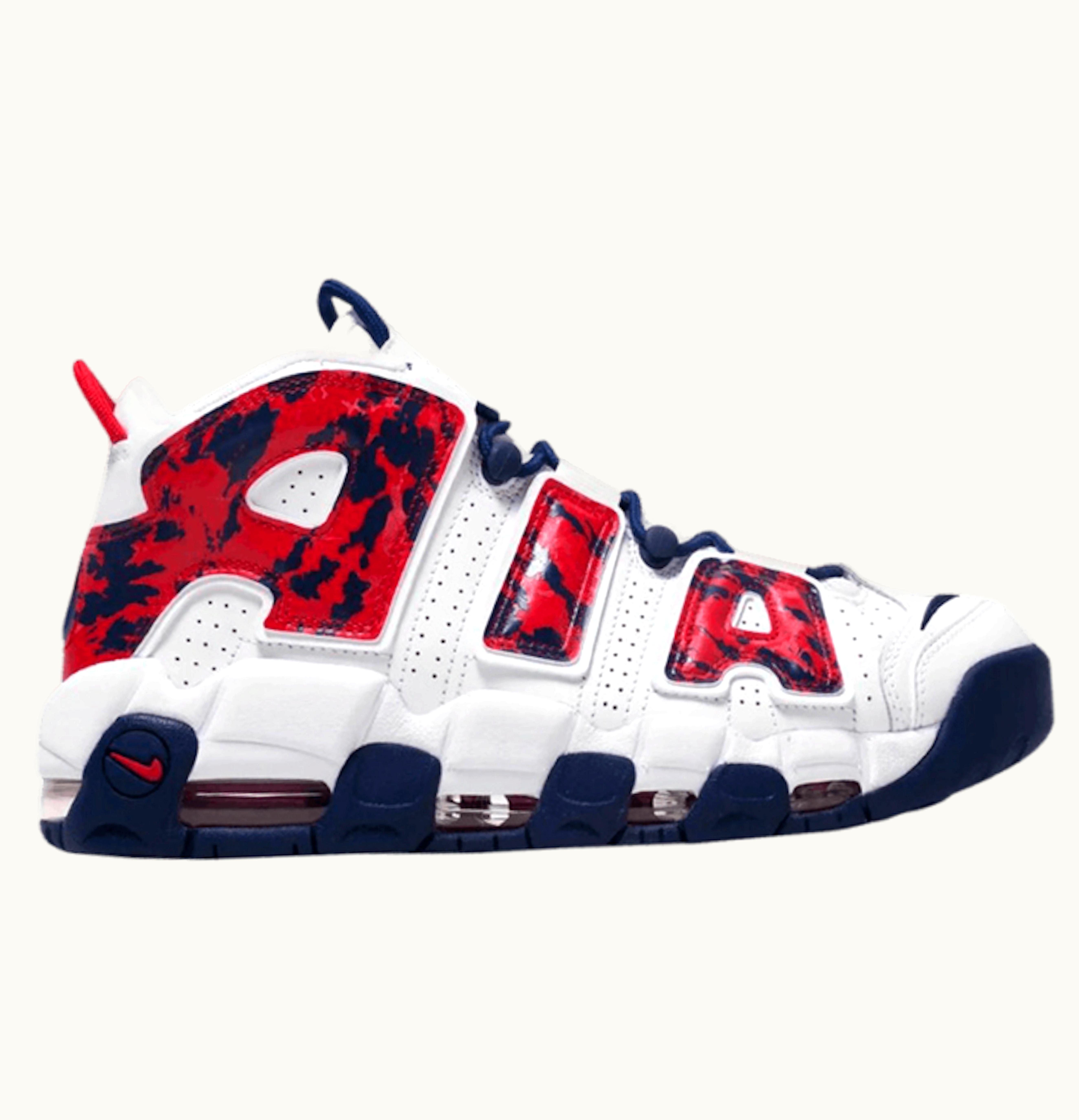The Nike Air More Uptempo Red Navy Camo is a stylish and fresh take on the classic basketball shoe from the 90s. Featuring a bold red and navy camouflage design on the upper, this shoe is sure to turn heads on and off the court. The shoe is crafted with premium materials, including a leather upper and a responsive Air-Sole unit, providing ultimate comfort and durability. The unique design is topped off with the iconic "AIR" lettering prominently displayed on the side, making this shoe an instant classic. Whether you're a basketball player or a sneakerhead, the Nike Air More Uptempo Red Navy Camo is a must-have addition to your collection.