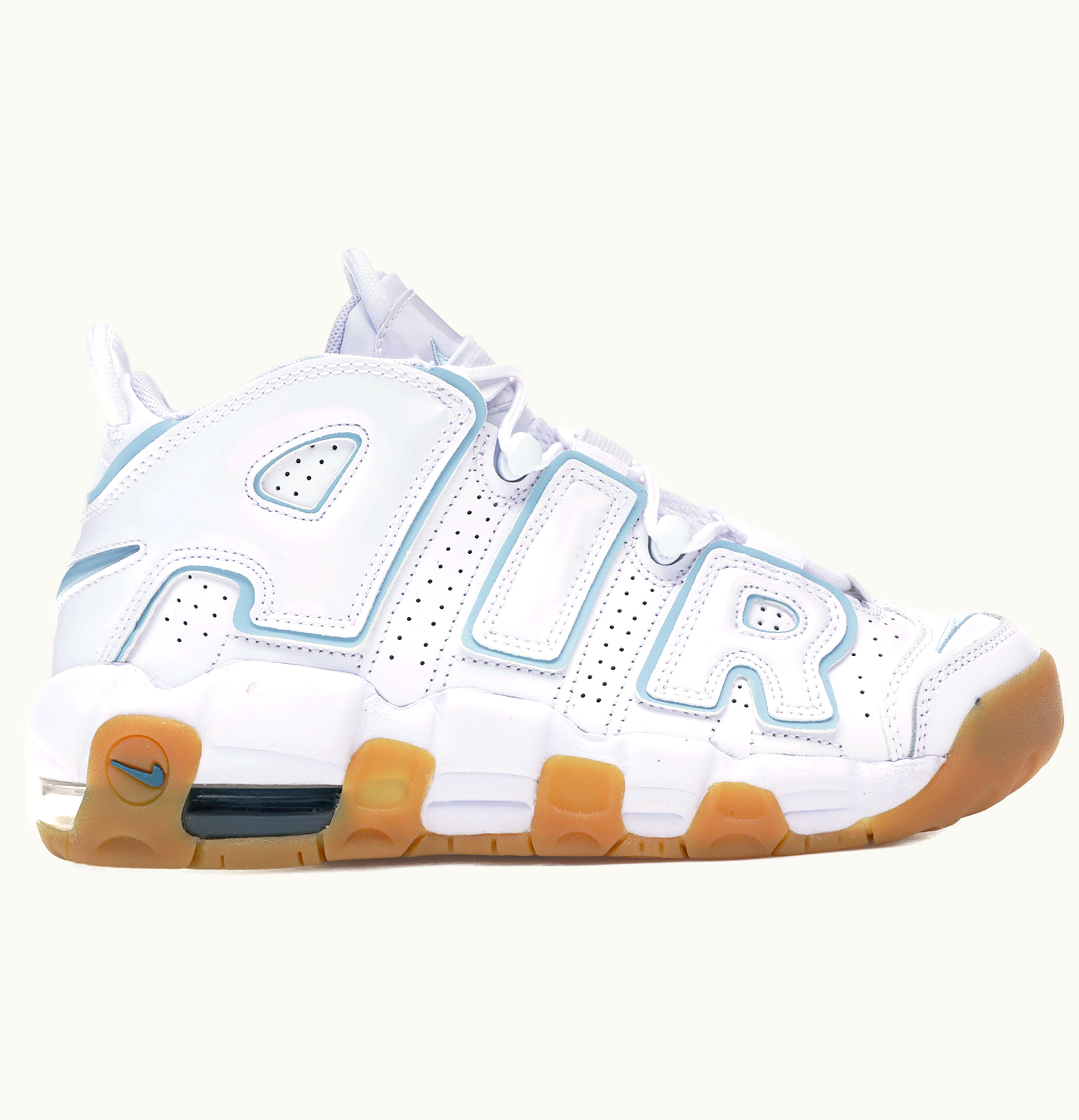 The Nike Air More Uptempo White Aqua Gum (GS) is a stylish and high-performance sneaker designed for young athletes and sneaker enthusiasts. The shoe features a sleek white leather upper with aqua blue accents and gum rubber outsoles for optimal traction and durability. The iconic "AIR" lettering is prominently displayed on the sides of the shoe in matching aqua blue, providing a bold and distinctive aesthetic. The Air-Sole units and Phylon midsole cushioning system provide superior comfort and shock absorption, making these sneakers perfect for daily wear or intense athletic activities. With its sleek design and advanced technology, the Nike Air More Uptempo White Aqua Gum (GS) is a versatile and fashionable addition to any sneaker collection.