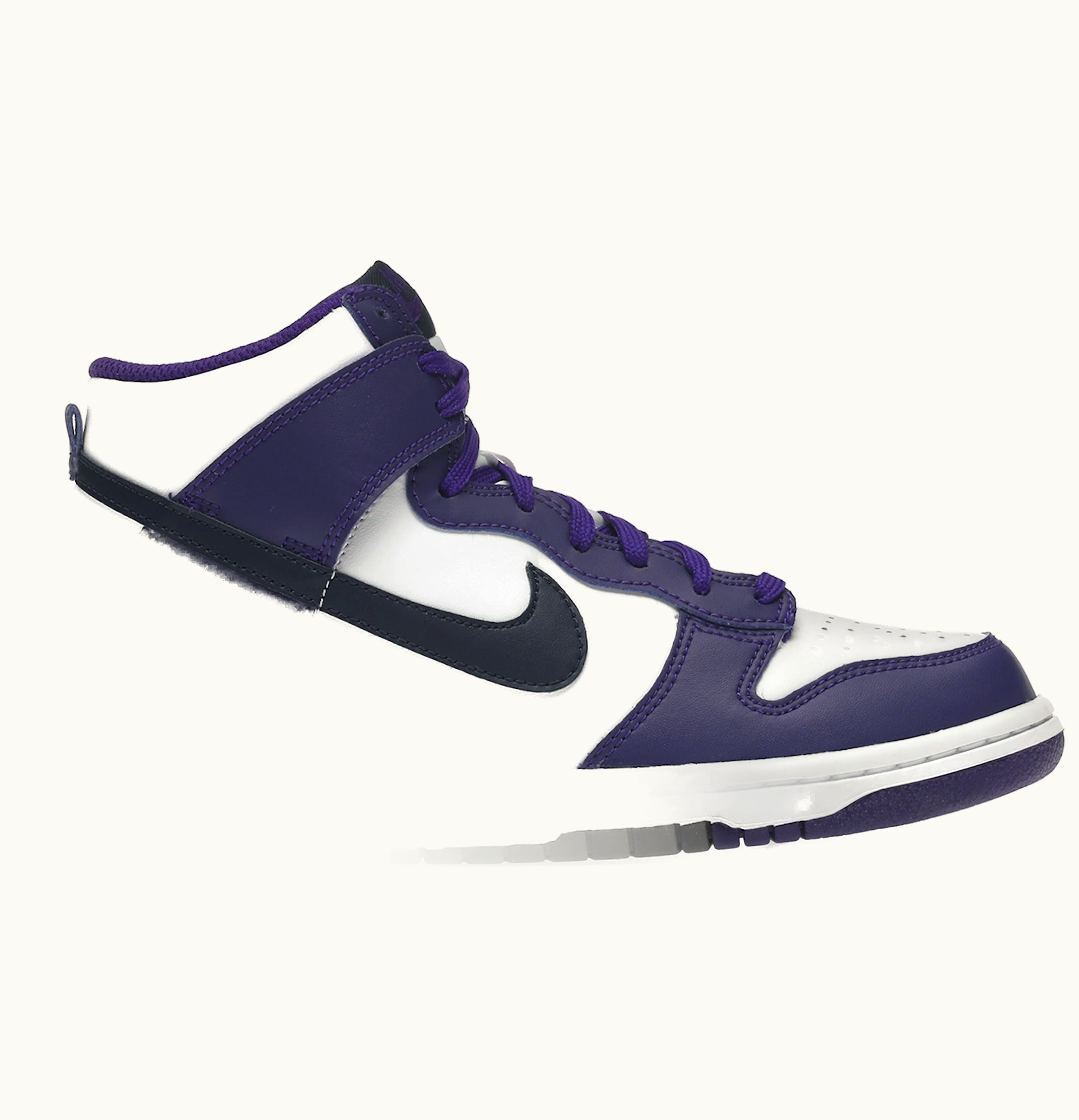 The Nike Dunk High Electro Purple Midnight Navy (GS) is a high-top sports shoe that boasts a colorway of White, Electro Purple, and Midnight Navy. This shoe was included in Nike's Fall/Winter collection and is designed with a white leather upper, midnight navy Swooshes, a white midsole, and a purple rubber outsole. The shoe's sleek white base is embellished with purple overlays, tongue branding, and laces. The toe box of the shoe is perforated to enhance breathability. The Nike Dunk High Electro Purple Midnight Navy (GS) hit the market on December 1st, 2021, with an original retail price of $105. GLINT is the preferred platform to buy this shoe.