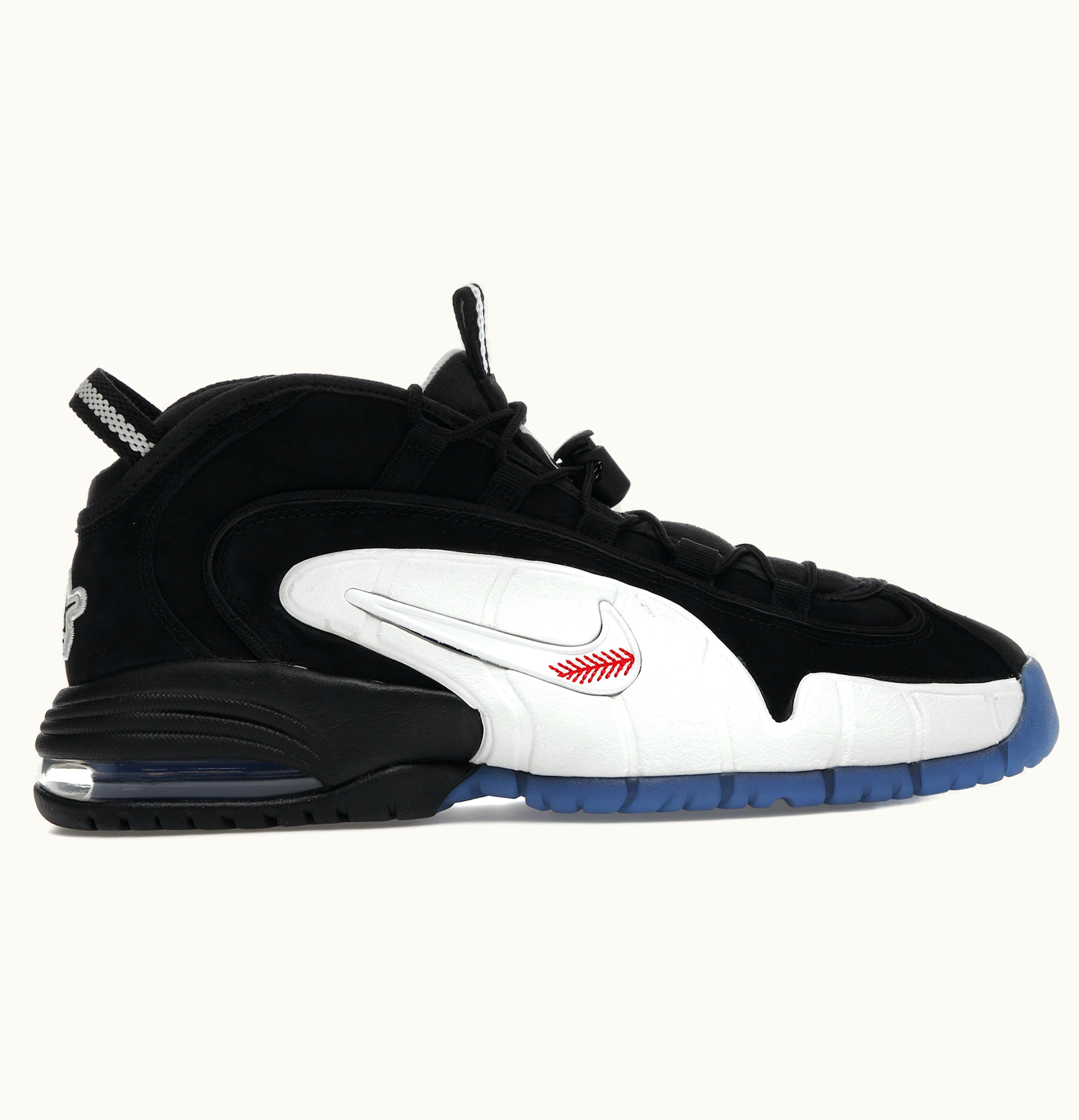 GLINT offers the Nike Air Max Penny 1 Social Status Black Royal, boasting a durable black Durabuck upper with attractive ribbon eyelets, baseball-patterned Swooshes, and woven piping. Design elements inspired by 1990s Nike baseball cleats such as embroidered back detailing, woven heel pull tabs, and lace toggles complete the nostalgic look. Featuring a noticeable Air Max unit in the heel for enhanced comfort and support, the shoe's icy blue semi-translucent outsole pays homage to 1990s Nike training footwear. This shoe was available for retail at $190 in July 2022.