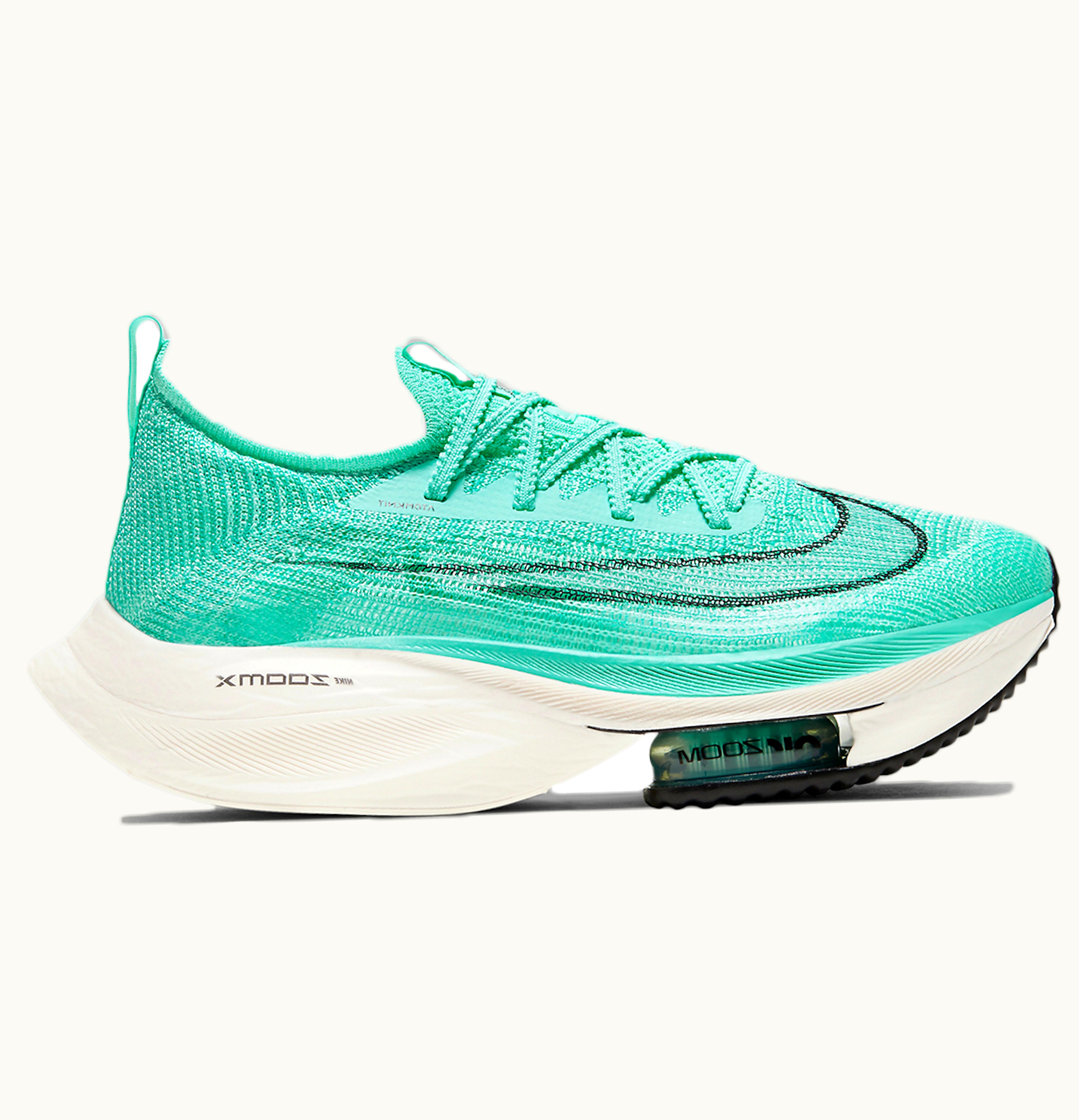 The Nike Air Zoom Alphafly Next Aqua Green (W) is a high-performance running shoe designed for female runners who want to push their limits. It features Nike's latest Flyknit technology, which is a lightweight and breathable material that provides a sock-like fit, allowing for maximum comfort and support during long runs. The shoe also has a responsive Zoom Air unit that creates a bouncy feel with each stride, increasing speed and reducing fatigue. The Aqua Green colorway adds a vibrant pop of color to your running ensemble. Additionally, the shoe has a carbon fiber plate in the midsole that delivers a smooth transition from heel to toe, while also maximizing energy return with every step. This shoe is perfect for runners looking for a fast, comfortable, and stylish shoe that will help them conquer any distance.