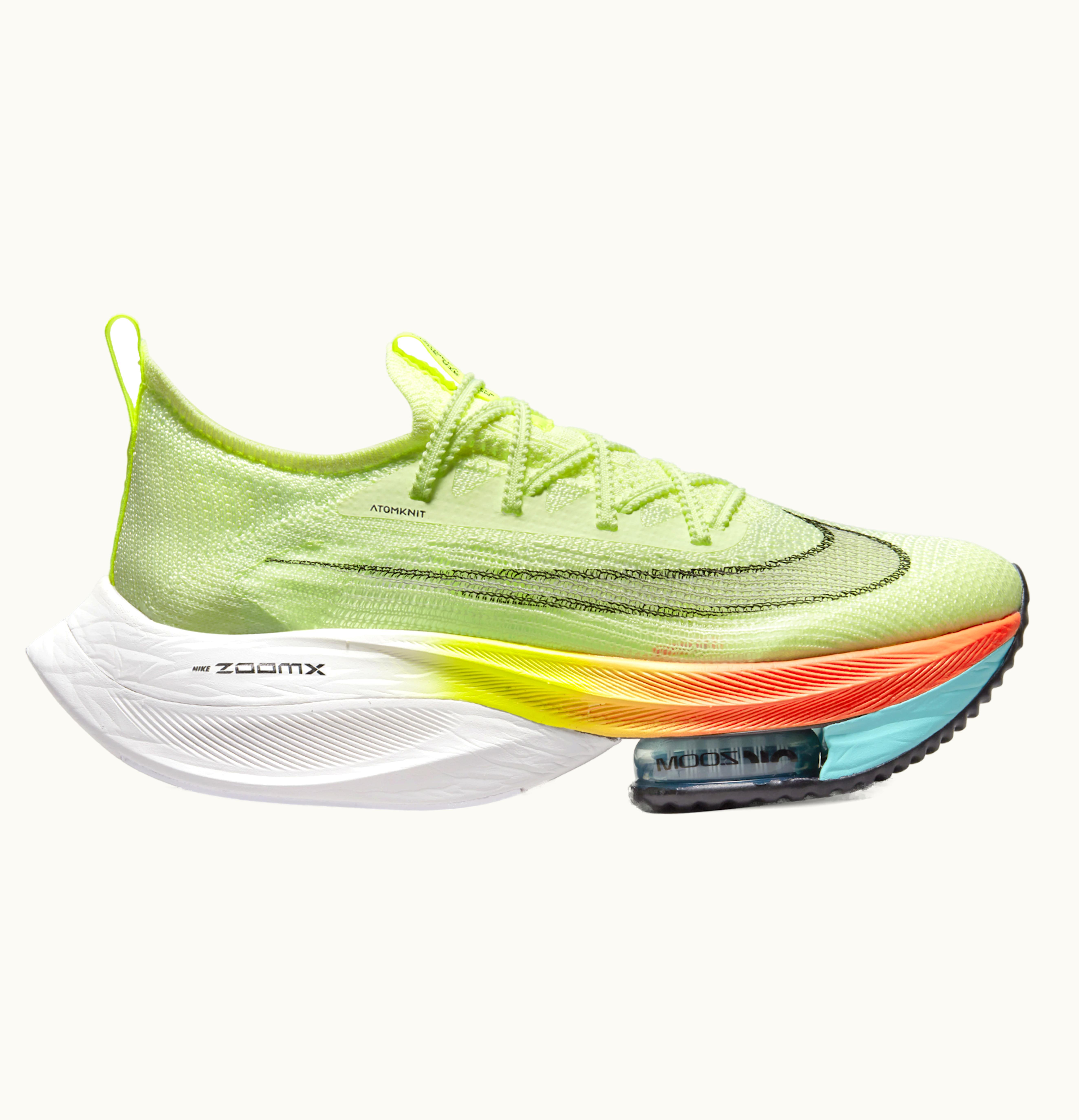 The Nike Air Zoom Alphafly Next% Barely Volt Orange (W) is a women's running shoe designed to deliver maximum speed and comfort for race days. Its upper is made from Flyknit material that hugs the foot for a snug fit, while a minimal heel counter provides added stability. The shoe is equipped with a full-length carbon fiber plate that reduces energy loss in each stride and an ultra-responsive ZoomX foam midsole that provides a comfortable and springy ride. The shoe's outsole features a rubber pattern that enhances grip and durability, and the shoe is finished in a striking Barely Volt and Orange colorway that ensures you stand out on the track.