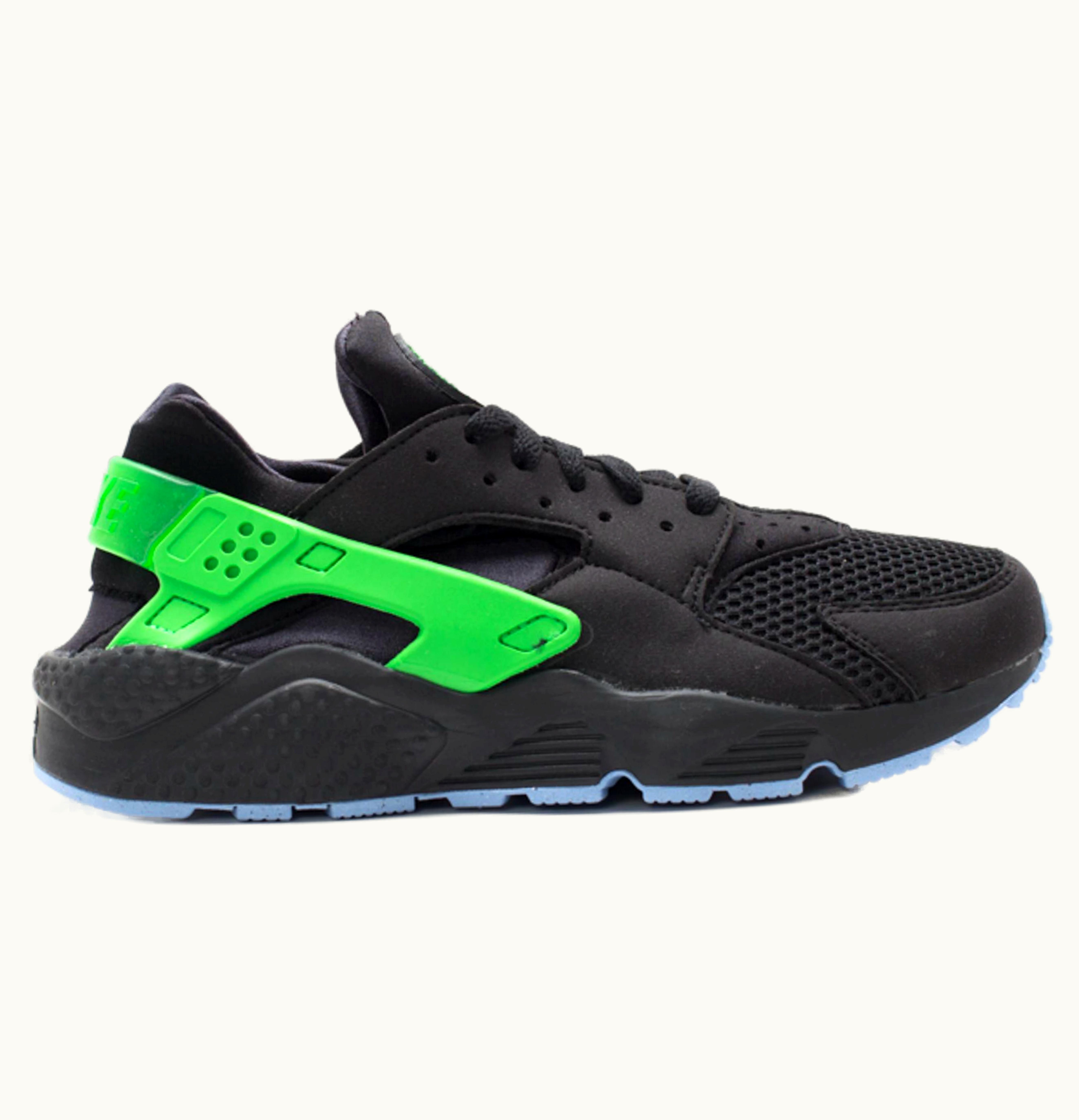 The Nike Air Huarache Run FB in Black Poison Green is a sleek, modern sneaker that combines contemporary style with classic design elements. The shoe features a black neoprene upper, accented with hits of Poison Green on the toe box, heel cap, and the signature Huarache heel strap. White detailing on the midsole and Nike Swoosh provide a bold contrast, while the iconic Huarache logo on the tongue rounds out the design. The shoe is built on a comfortable, lightweight Phylon midsole with an encapsulated Air-Sole unit in the heel for cushioning and support. The outsole is made of durable rubber, providing excellent traction and grip. Whether you're hitting the streets for a run or just looking for a stylish everyday shoe, the Nike Air Huarache Run FB is the perfect choice.