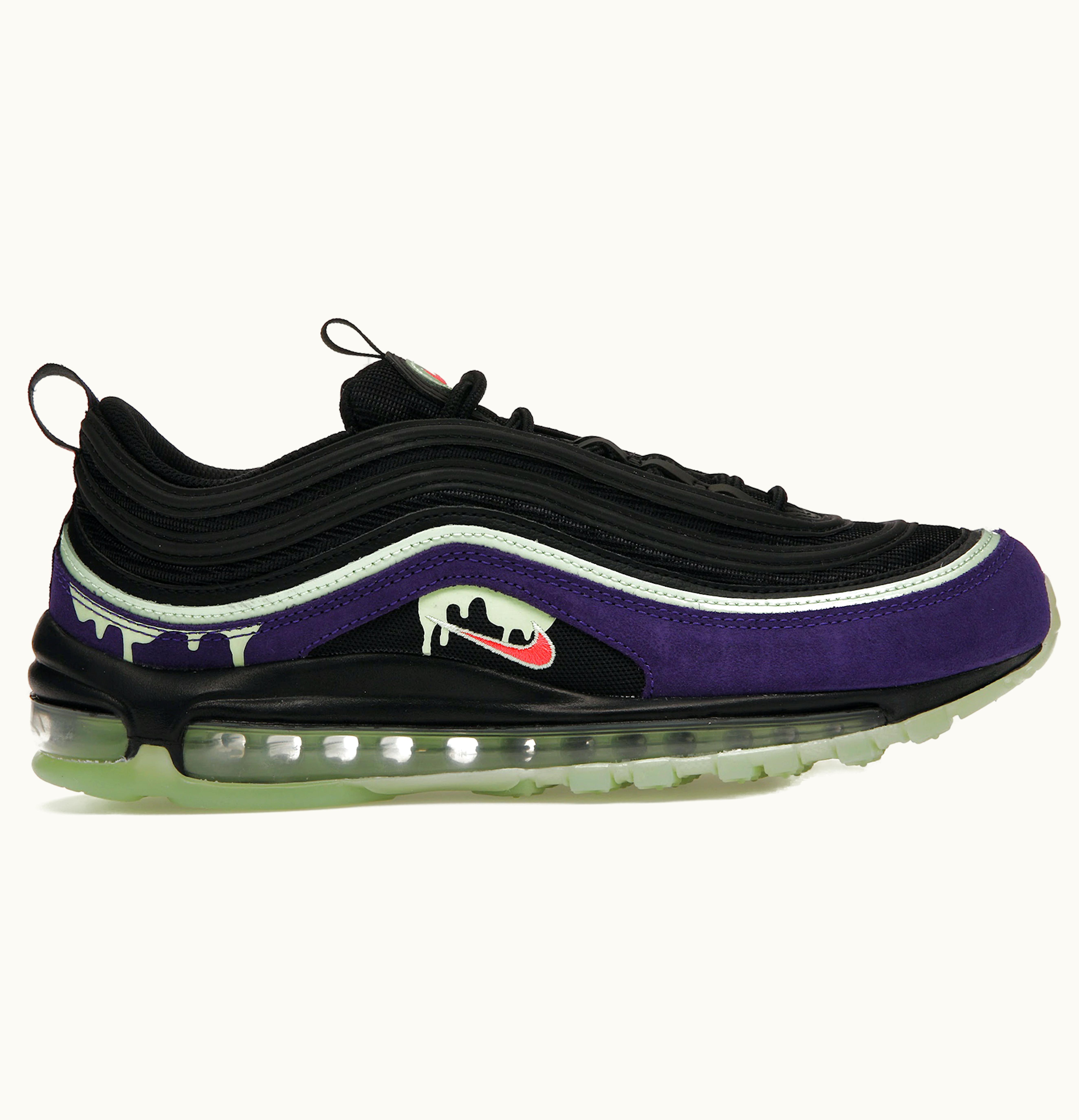 Last year in 2020, Nike marked the occasion of Halloween by launching their new Nike Air Max 97 Slime Halloween sneakers. These shoes come in a spooky Black/Flash Crimson/Court Purple colorway, that perfectly suits the theme of the holiday. The sneaker's black mesh upper boasts the notable wavy paneling alongside 3M reflective detailing. What makes it stand out is the purple suede mudguard wrapping the shoe, and the slime graphics dripping down from the Swoosh and on the heel. The outsole of the Nike Air Max Halloween Slime is translucent and glows in the dark, making it even more suitable for the holiday. Retailing for $180, GLINT was the platform chosen for its release in October of 2020.