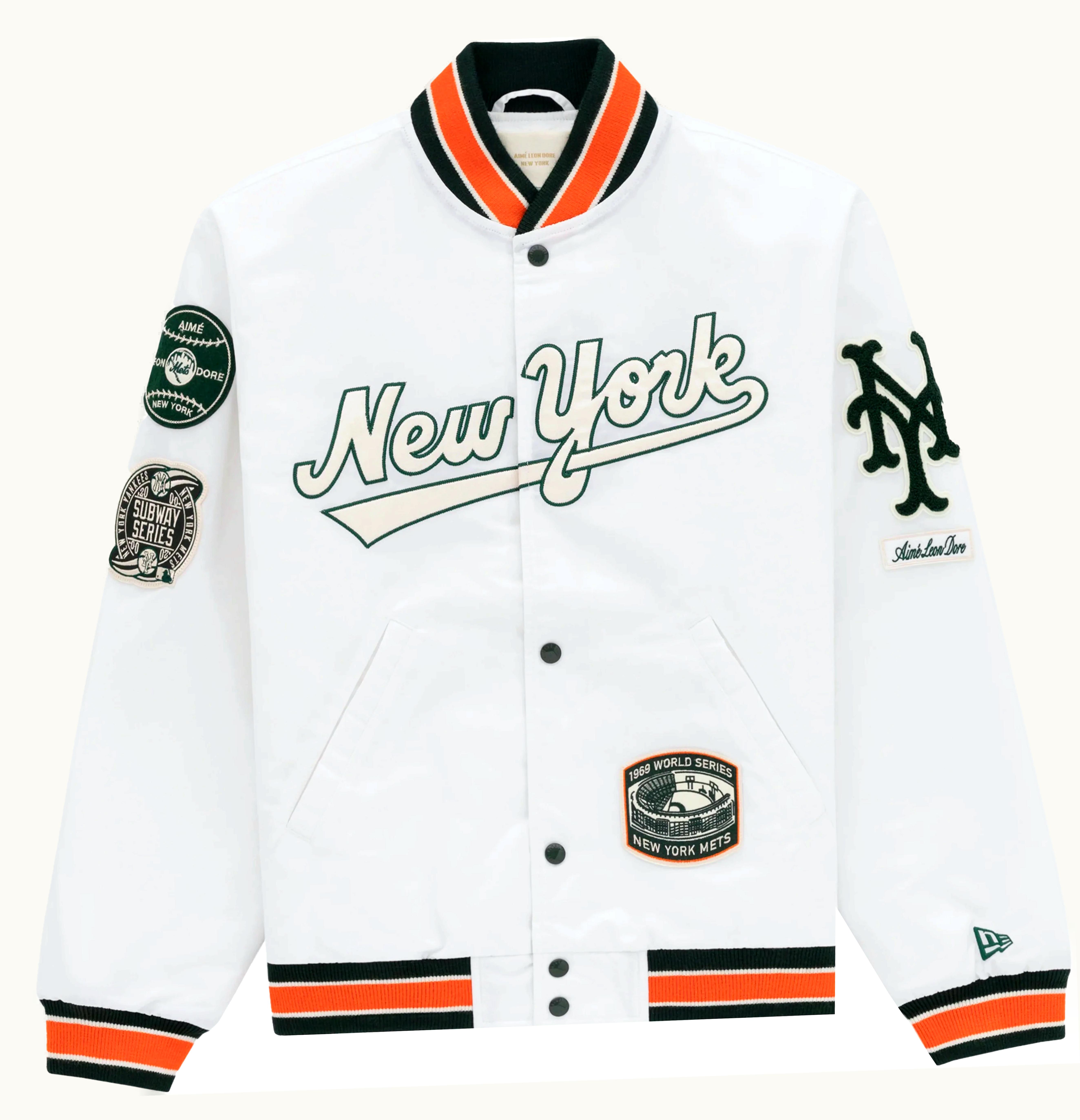 The Aime Leon Dore Mets Satin Stadium is a high-end men's jacket that exudes style and sophistication. The jacket is made from a luxurious satin fabric that is both durable and comfortable to wear. The Mets Satin Stadium features a classic, varsity-style design with bold, contrasting stripes on the collar, cuffs, and hemline. The jacket is available in a range of vibrant colors, from classic navy and black to eye-catching shades like bright orange and electric blue. Other notable features of the Aime Leon Dore Mets Satin Stadium include a full zip-front closure, two front pockets with snap closures, and the signature Aime Leon Dore logo embroidered on the chest. Whether you're hitting the town or cheering on your favorite sports team, the Aime Leon Dore Mets Satin Stadium is the perfect jacket for any occasion.