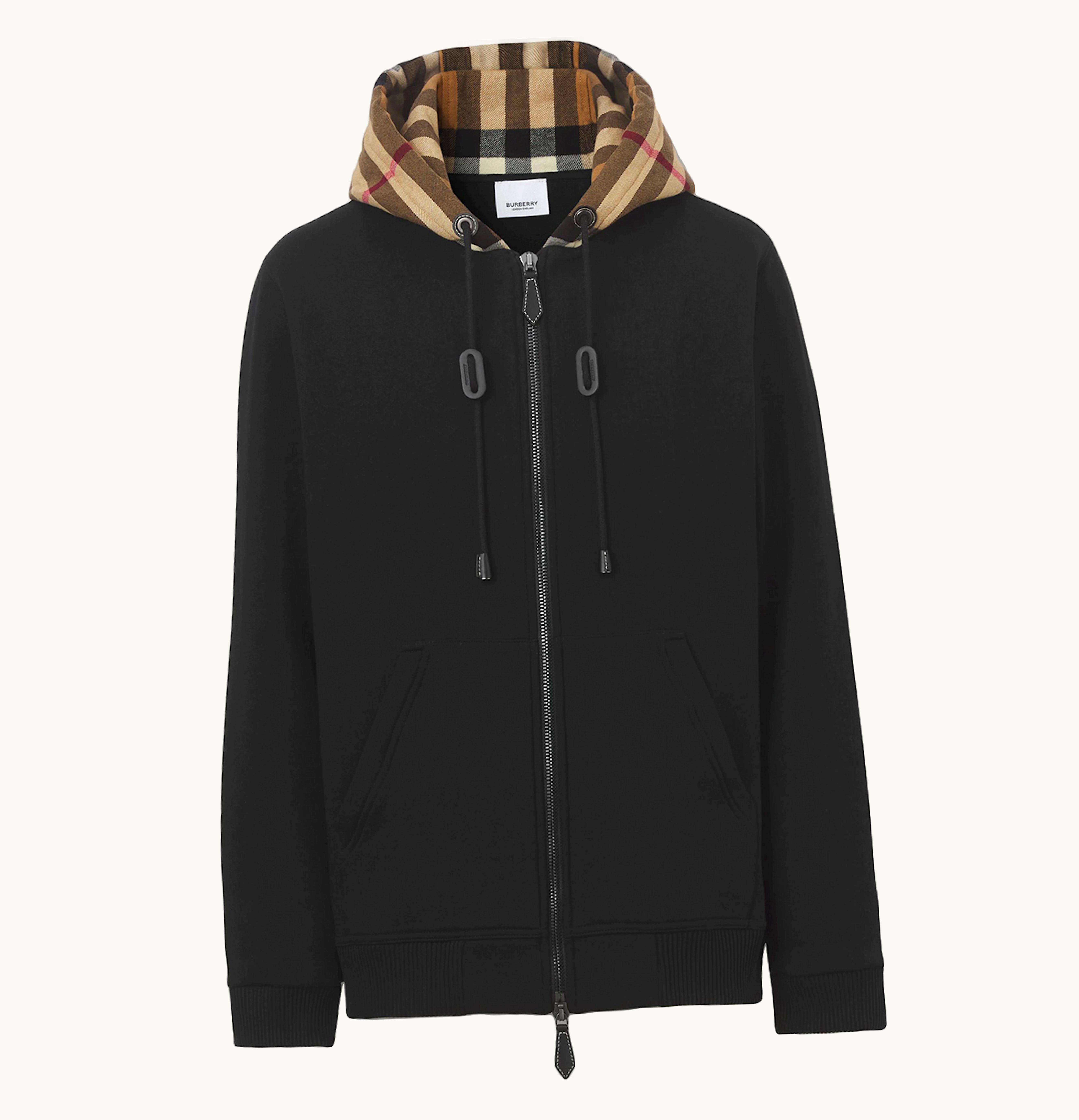 Burberry Check Hood Cotton Blend Zip Front Hooded Top Black Archive Beige | GLINT