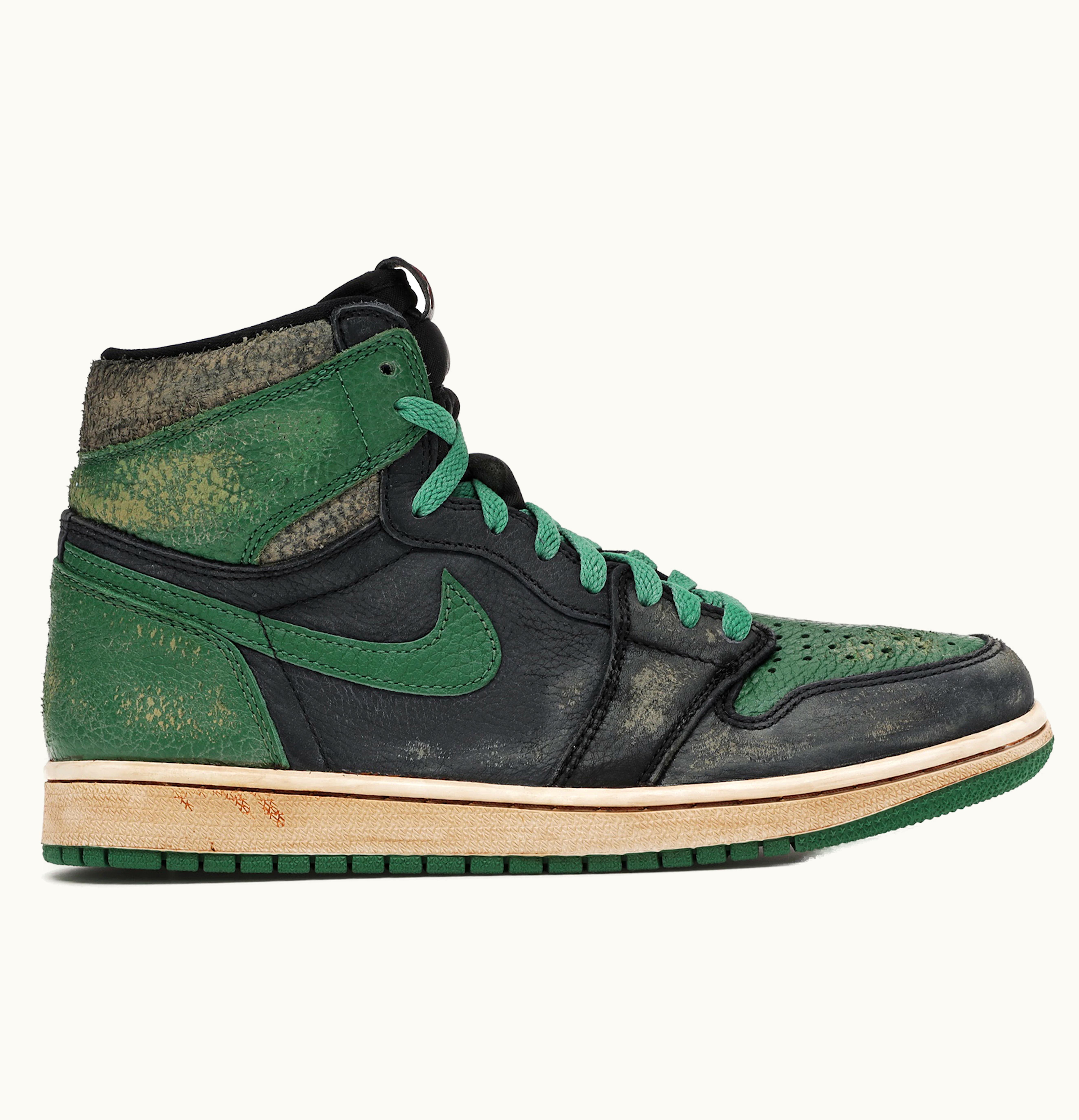PHILLLLLTHY, the creator behind the popular "Aged" Fire Red Jordan 5s Dropx, is releasing his latest custom creation - the Aged Jordan 1 Pine Green Blacks. These shoes showcase his distinct erosion style on the heel tab, midsole, and toe box, as well as his name and signature on the underside of each insole. <br><br> These sneakers are extremely limited, with only six pairs available in sizes 8 to 13. They are priced at $450 each and will be sold on a first-come-first-serve basis. It's important to note that orders won't arrive until 2-3 weeks after purchase. <br><br> Additionally, all transactions for these shoes will be made exclusively through GLINT, and not through GLINT.