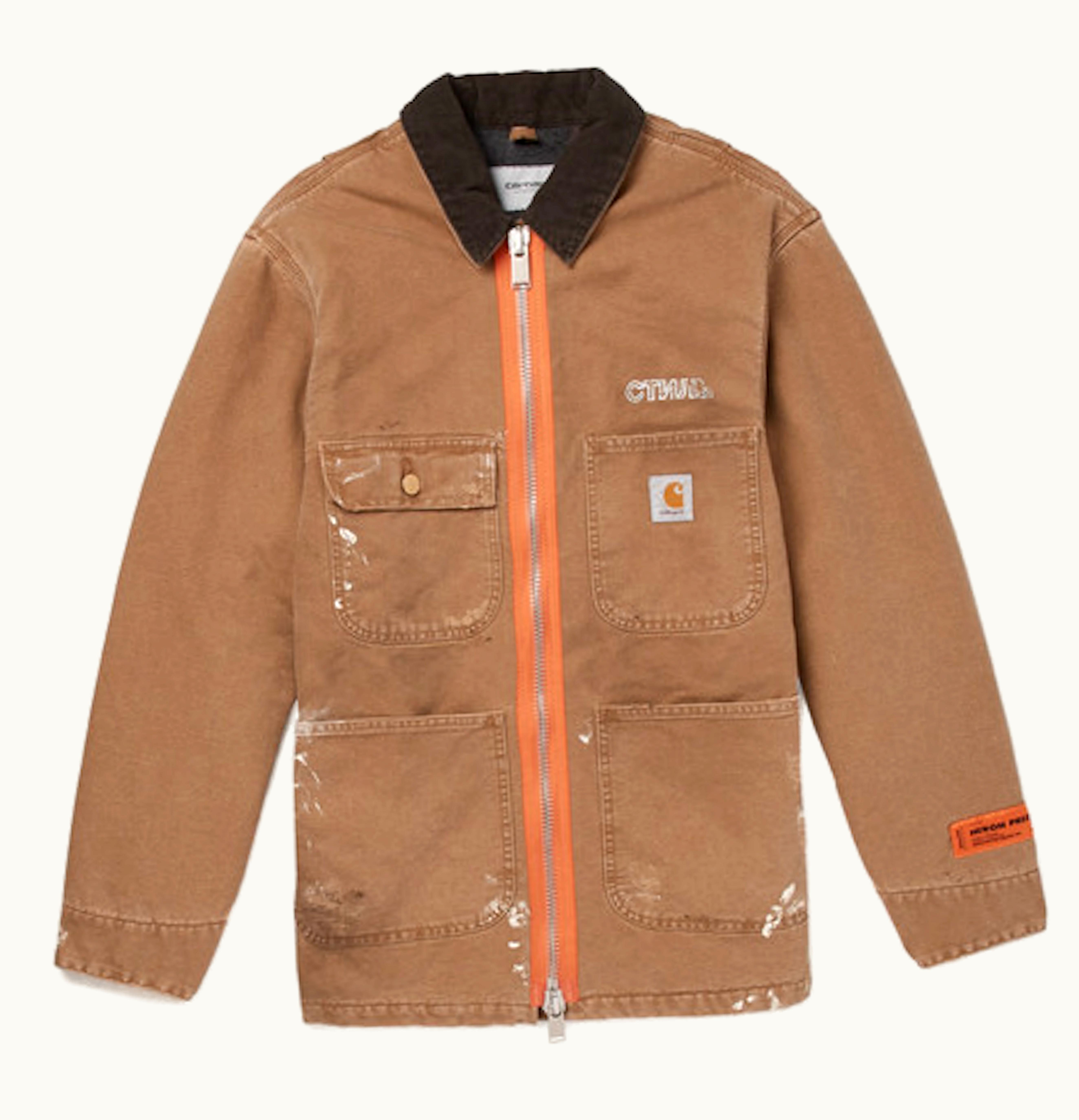 The Heron Preston x Carhartt Oversized Corduroy Collar Canvas Work is a premium quality work jacket that combines the expertise of two renowned fashion giants. Made from durable canvas fabric, this jacket features an oversized corduroy collar that provides superior warmth and comfort in cold weather. The jacket has a relaxed and oversized fit that adds to its style and utility. It has multiple pockets, including side pockets, chest pockets, and an interior pocket, giving you ample space to store your essentials. The jacket features the Heron Preston signature orange label attached to the chest pocket, adding to its aesthetic appeal. The jacket is versatile and can be worn in any casual or work setting. It is a must-have for anyone looking for a comfortable and stylish work jacket that can withstand even the toughest of conditions.