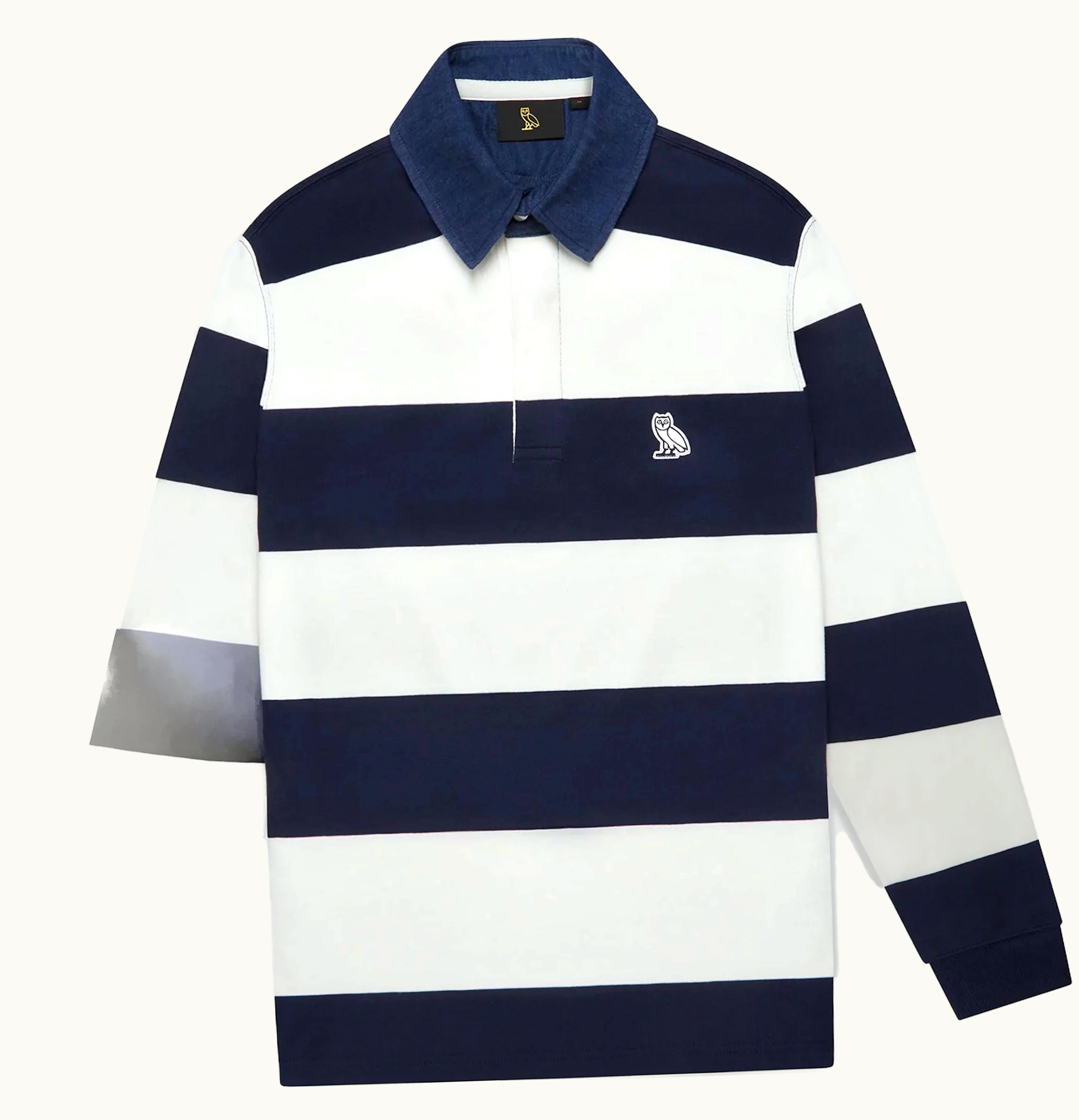 The OVO Denim Collar Rugby is a unique and stylish piece of clothing designed for both comfort and fashion. The shirt features a classic rugby-style design with a denim collar and button-up placket, giving it a modern and trendy twist. It is made from high-quality cotton material, ensuring it is durable and can withstand regular wear and washing. The shirt's blue and white striped pattern adds to the classic yet fashion-forward look, making it perfect for any casual occasion. This rugby shirt is also adorned with a small embroidered OVO owl logo on the chest, making it a must-have for any Drake or OVO fan. Overall, the OVO Denim Collar Rugby is a versatile and fashionable clothing item that can be worn for casual events or dressed up for a night out.
