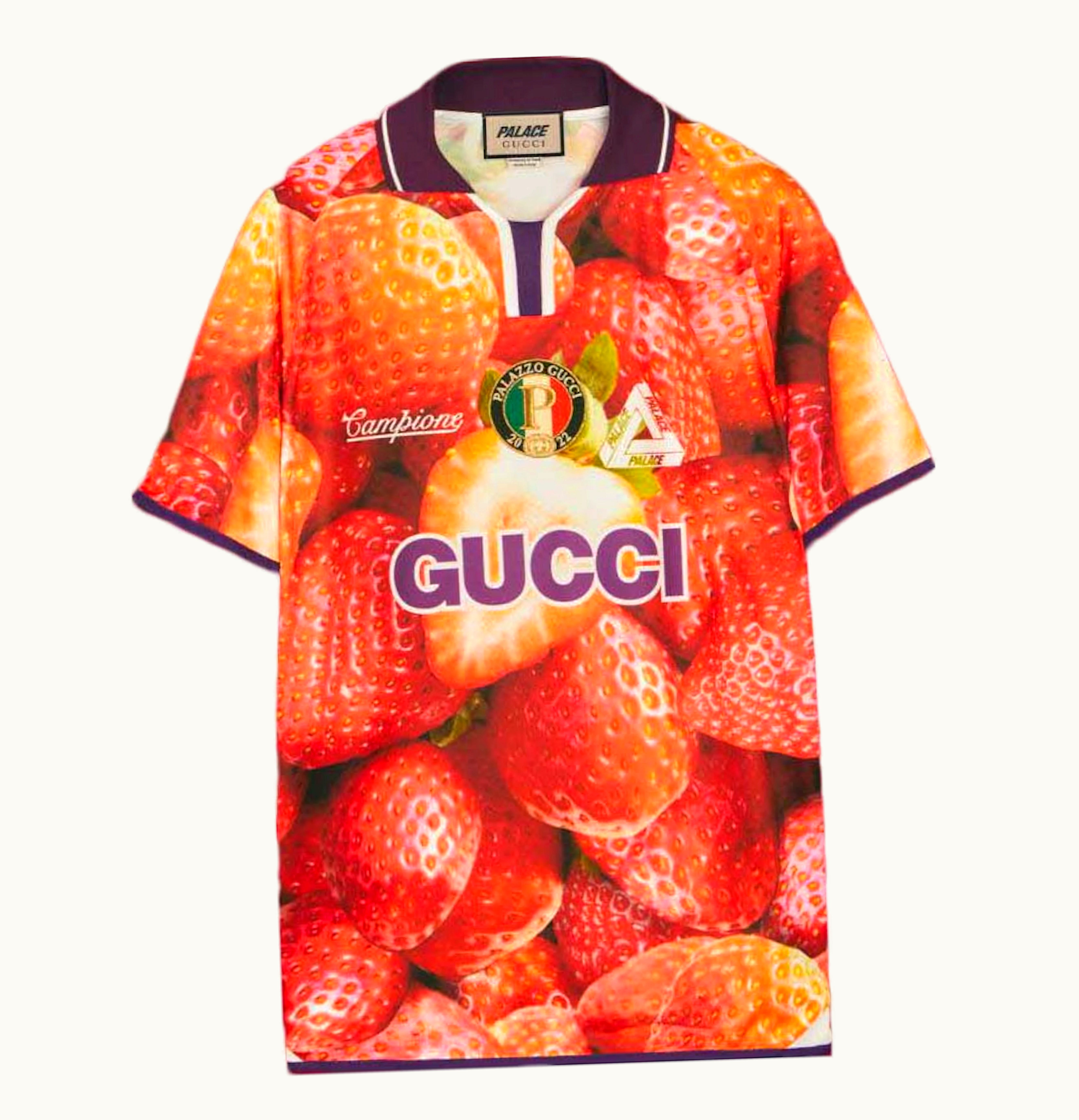 Palace x Gucci Strawberry Print Technical Jersey Football T shirt Red | GLINT
