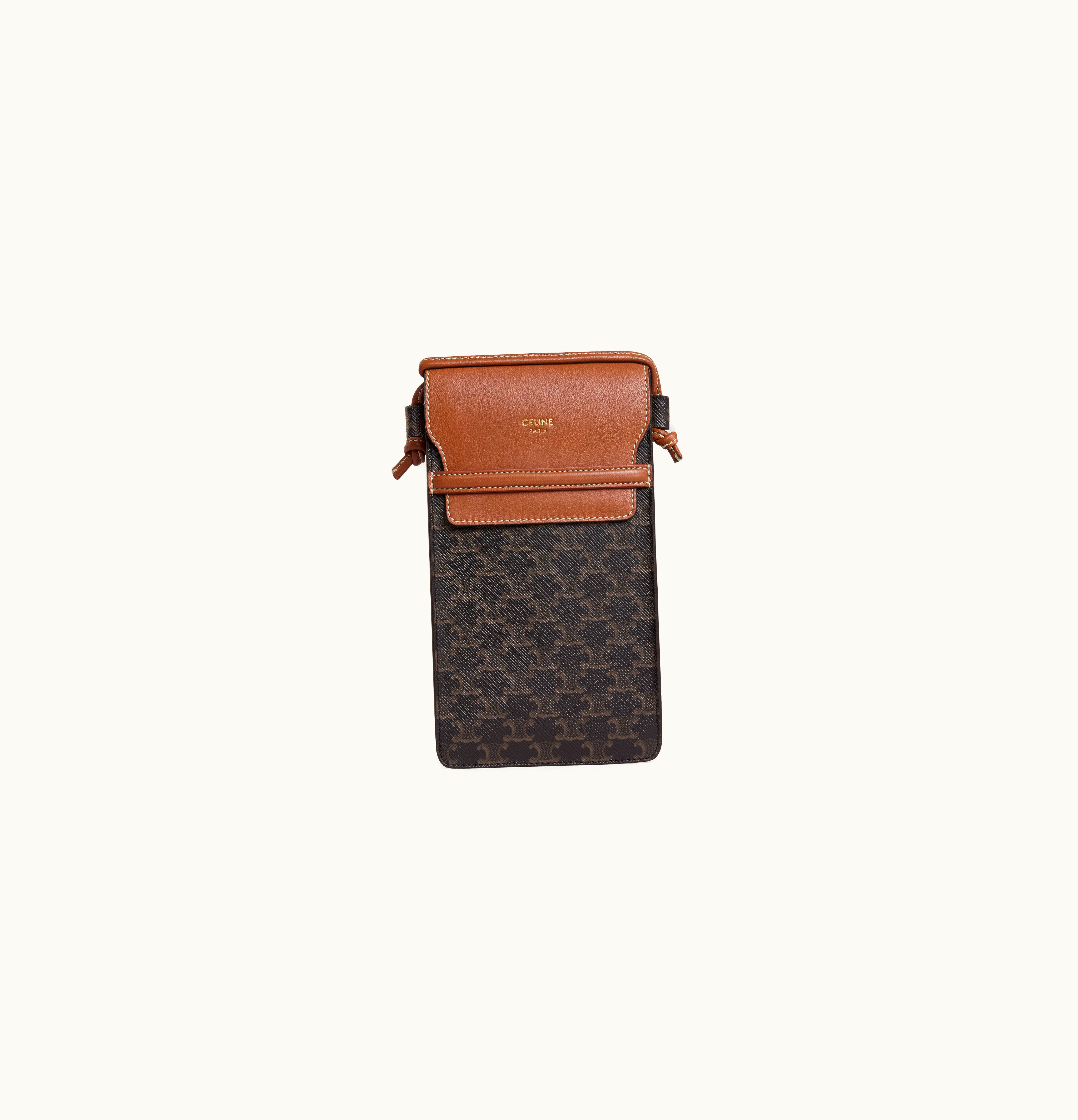 Celine Phone Pouch With Flap In Triomphe Canvas And Lambskin Tan | GLINT