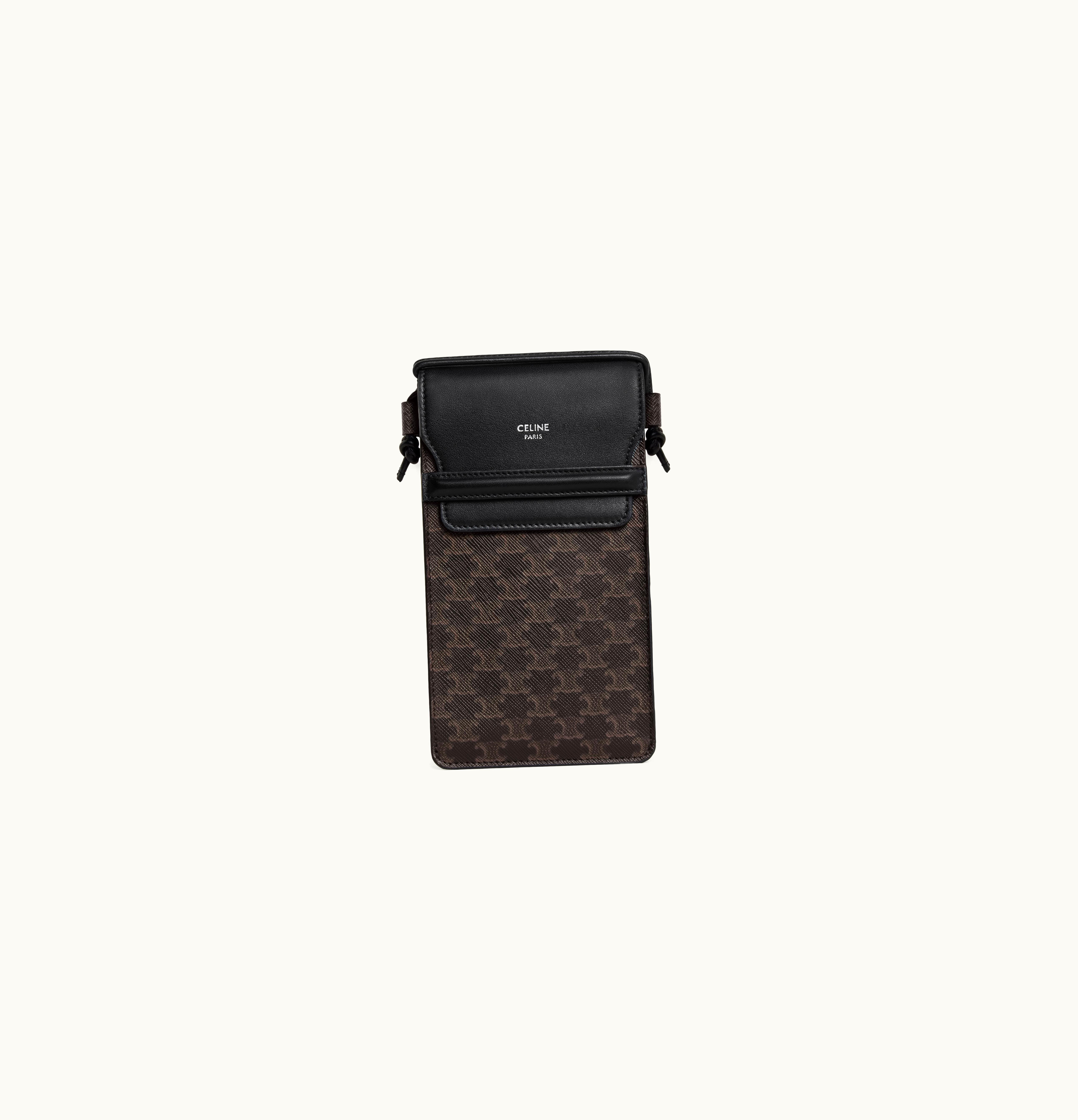 Celine Phone Pouch With Flap In Triomphe Canvas And Lambskin Black | GLINT