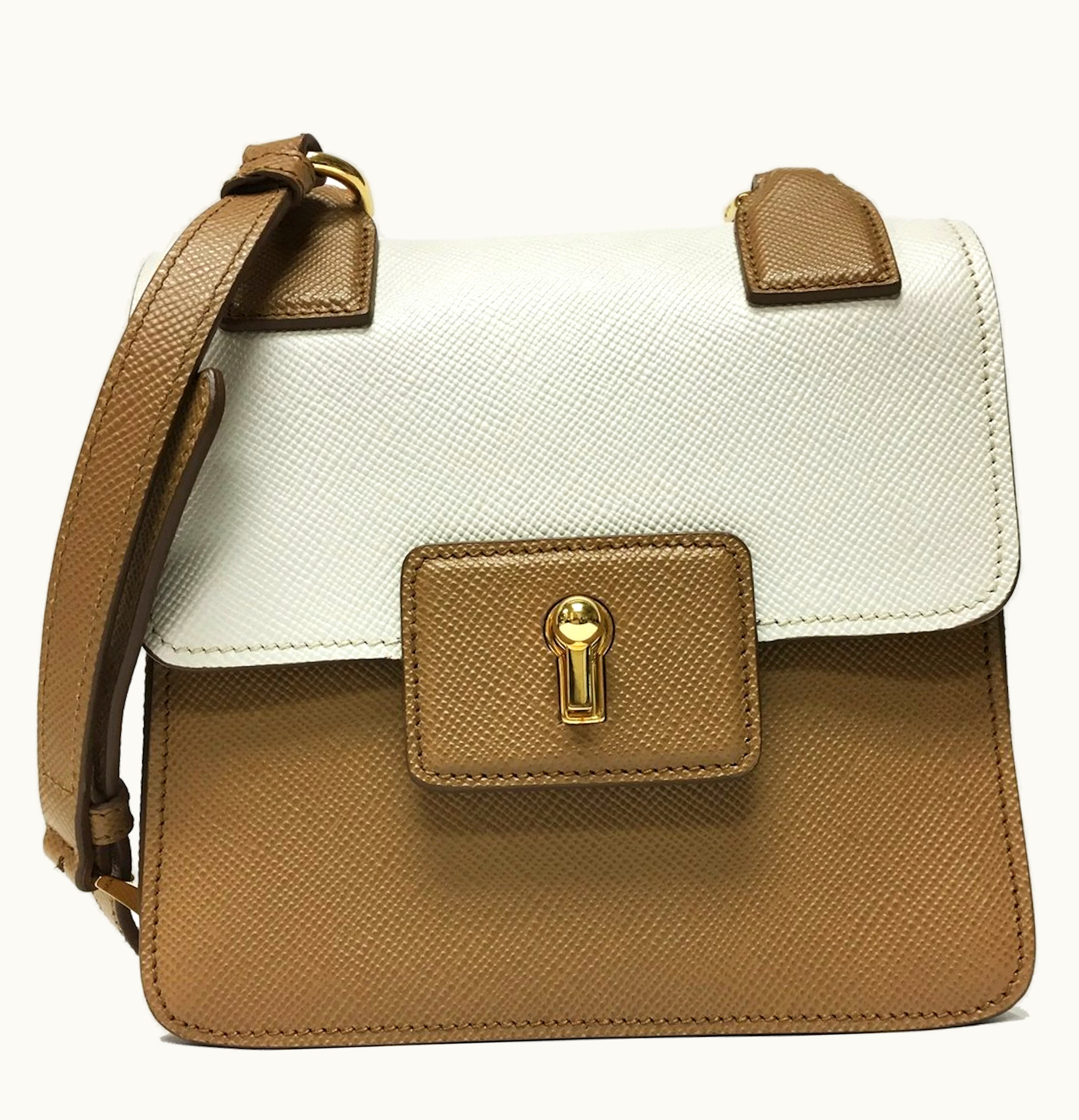 Prada Cuir Pattina Shoulder Bag Saffiano Caramel Beige Talco White | GLINT