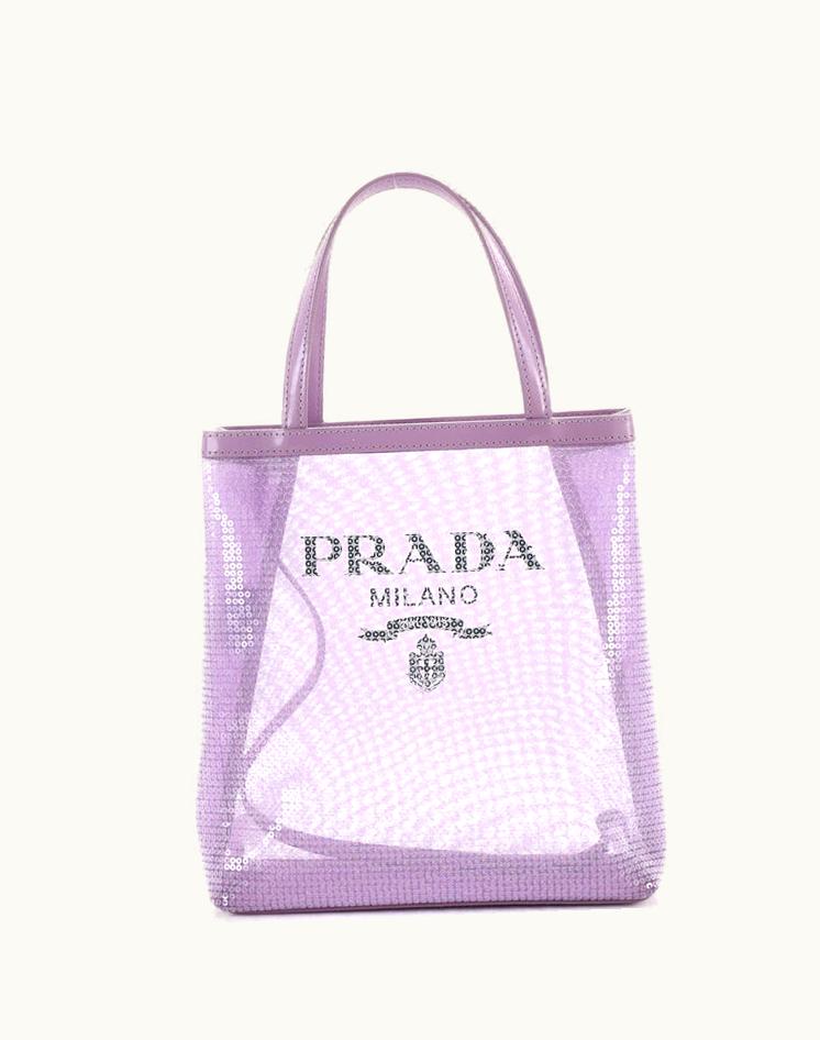 Prada Logo Open Tote Sequined Mesh Small Luxury Tote Bag Purple | GLINT