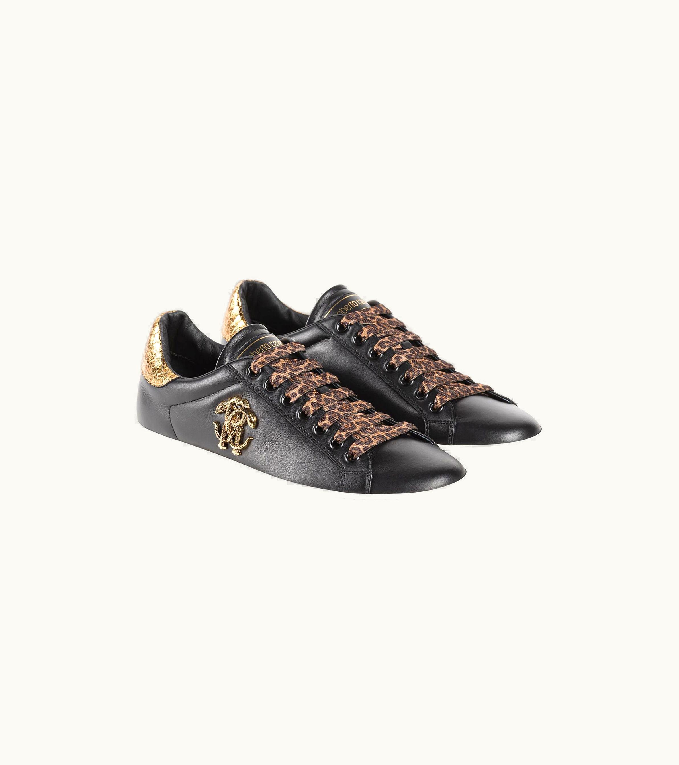 Roberto Cavalli Logo-plaque Leather Sneakers Nero / Oro | GLINT