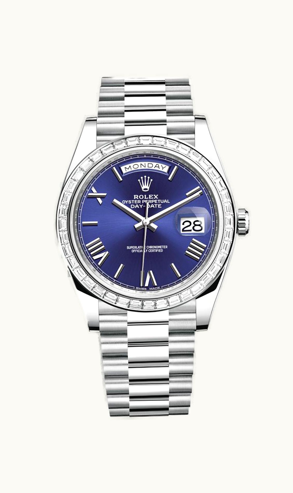 Rolex Day-Date 40 Platinum - Baguette / Blue Roman 228396tbr-0026 | GLINT