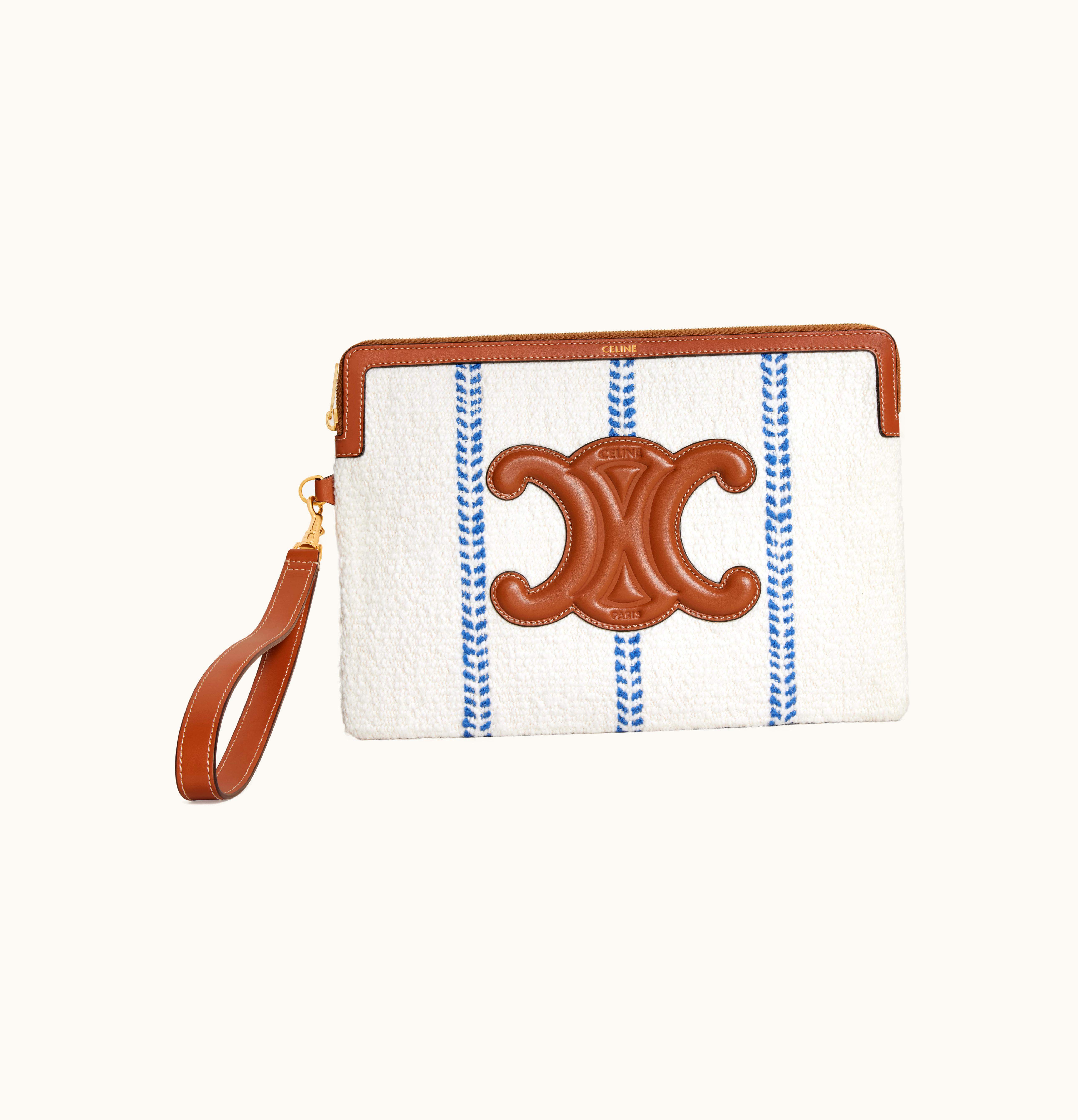 Celine Small Pouch With Strap In Striped Textile And Calfskin White/Blue | GLINT