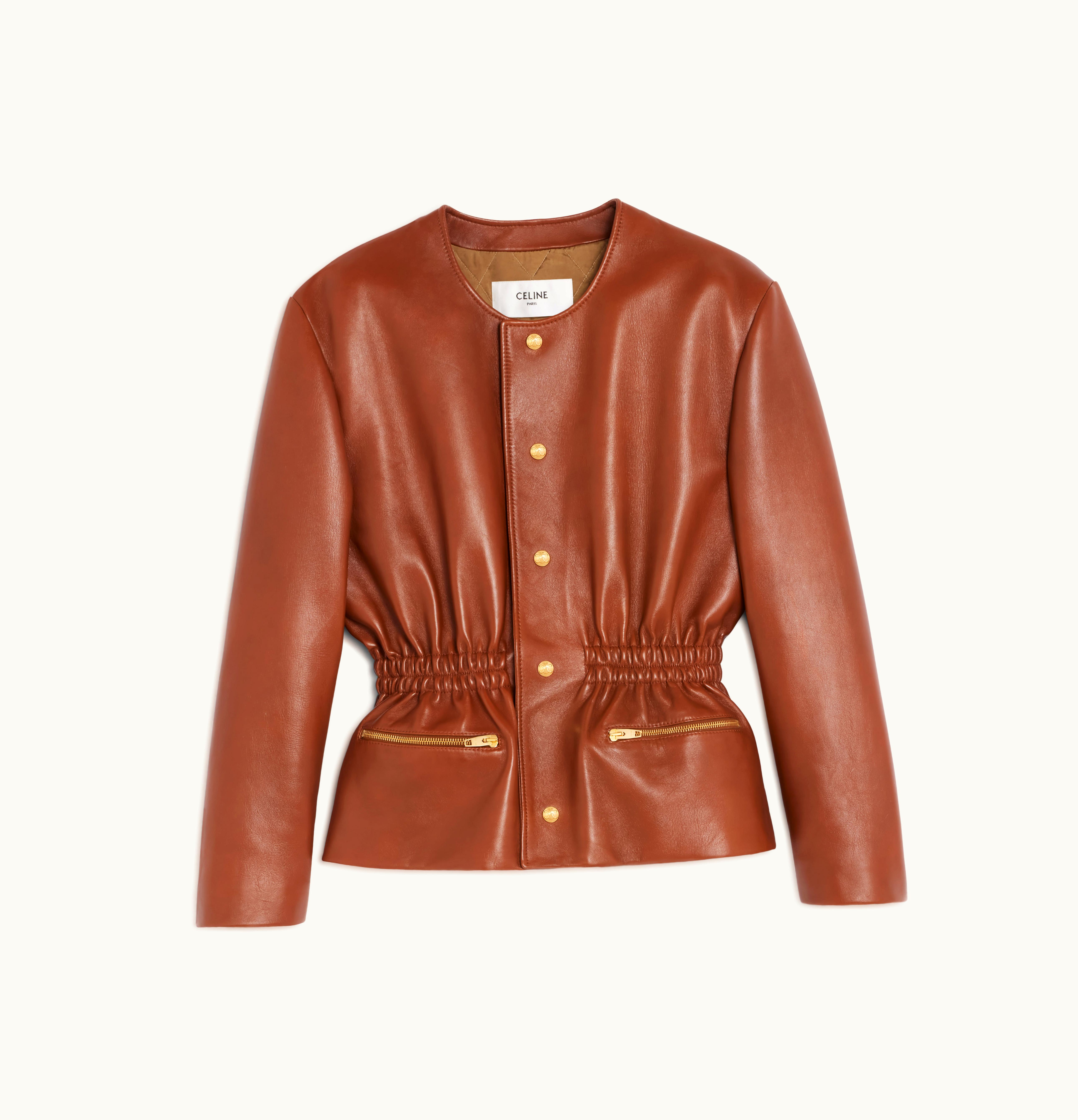 Celine Smocked Belted Jacket In Soft Lambskin Cognac | GLINT